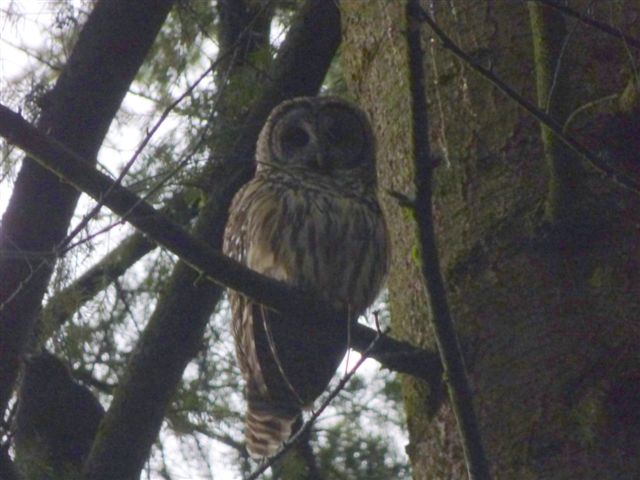 Hans sighted some Varied Thrushes as well. Kirsten came running back to inform us she had found the Barred Owl being harassed by crows, so we rushed off to the lower cedar grove where we had a good look at the owl high in a tree with a pair of crows sitting beside it. Unfortunately, the light was too poor to get a clear photo.