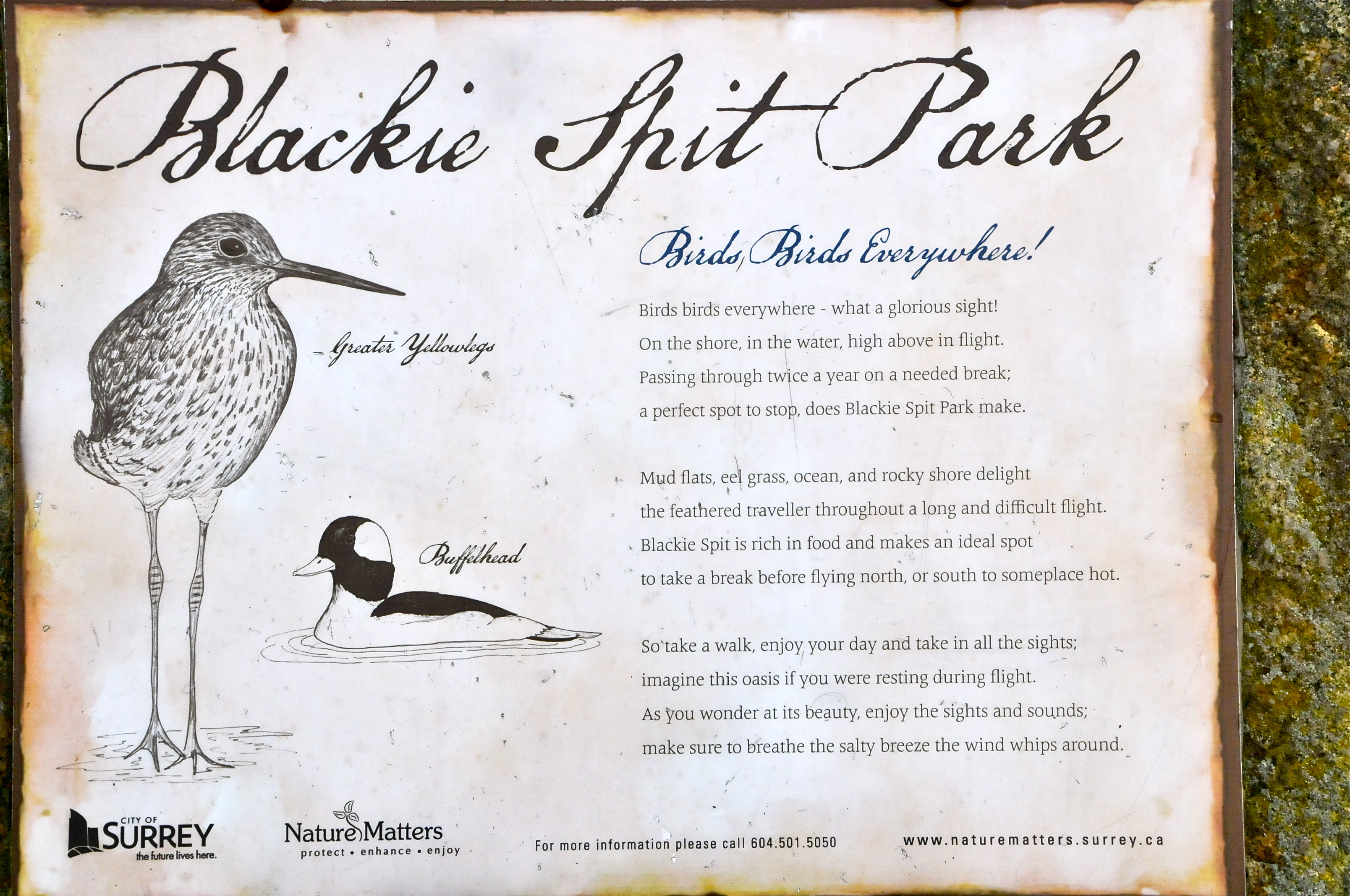 At about 8:30, eighteen enthusiastic bird aficionados assembled at Blackie Spit Park, which is named after – as someone in the back of the pack correctly pointed out – a chap named Blackie.  Walter Blackie, who was – wait for it – New Westminster’s first Blacksmith, acquired 150 acres at Crescent Beach in 1871 for 50 dollars.  Dykes were built and some farming was done, but the area was later purchased by the government and used as a dumping ground for sand and silt dredged from the Nicomekl River to deepen the channel to the bay.  Because the habitat for up to 90 varieties of plants and more than 190 species of birds was being destroyed, the WRS Naturalists and local residents lobbied to have the area dedicated as a park.  Success came in 1996 as the result of a Surrey-wide referendum.