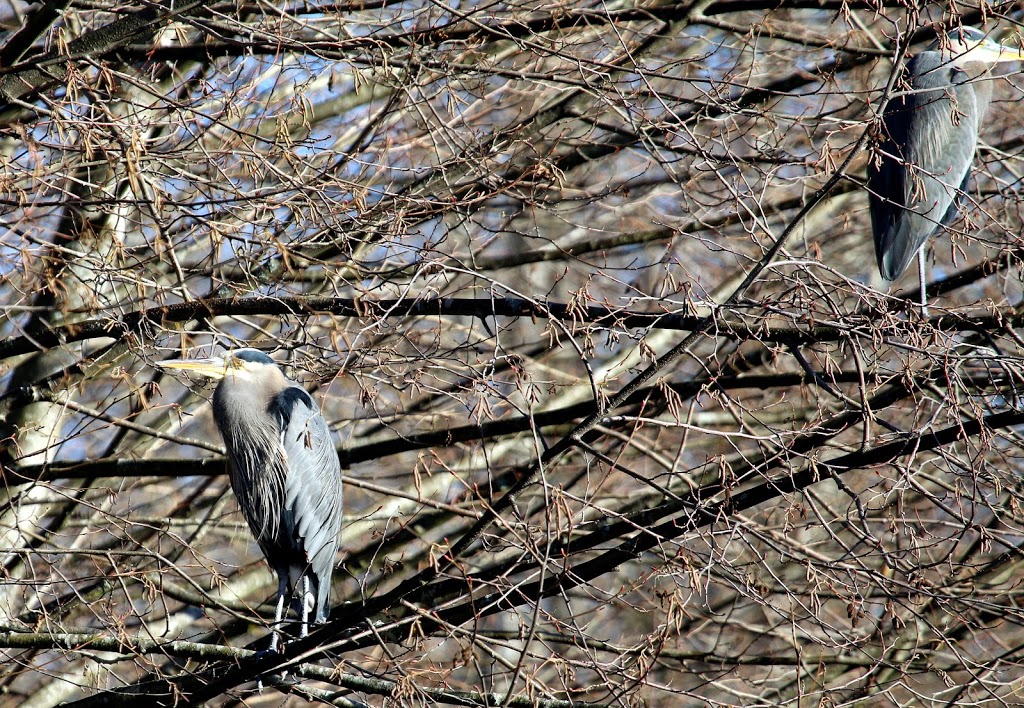 Again, many towhees and chickadees were seen rummaging through the bushes and shrubs. A Pair of Northern Flickers finally appeared; we heard them calling throughout the park. We came upon at least seven Great Blue Herons perched in the woods above a frozen pond.