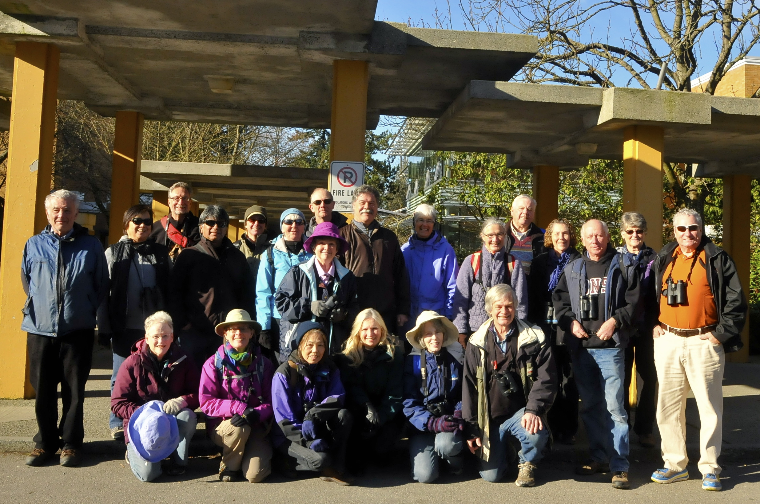 A brilliant, sunny but cool day saw 9 members meet at Petra’s to carpool to UBC, Old Marine Drive for 9 a.m. Others met there as did our westside resident guide, Bev Ramey. From our parking spot in Pacific Spirit Park, 25 of us walked west to Totem Park and adjacent forest where a Northern Flicker, Steller’s Jay and Song Sparrow were spotted. We had our DNCB group photo taken by the lovely Frances in front of Totem residences.