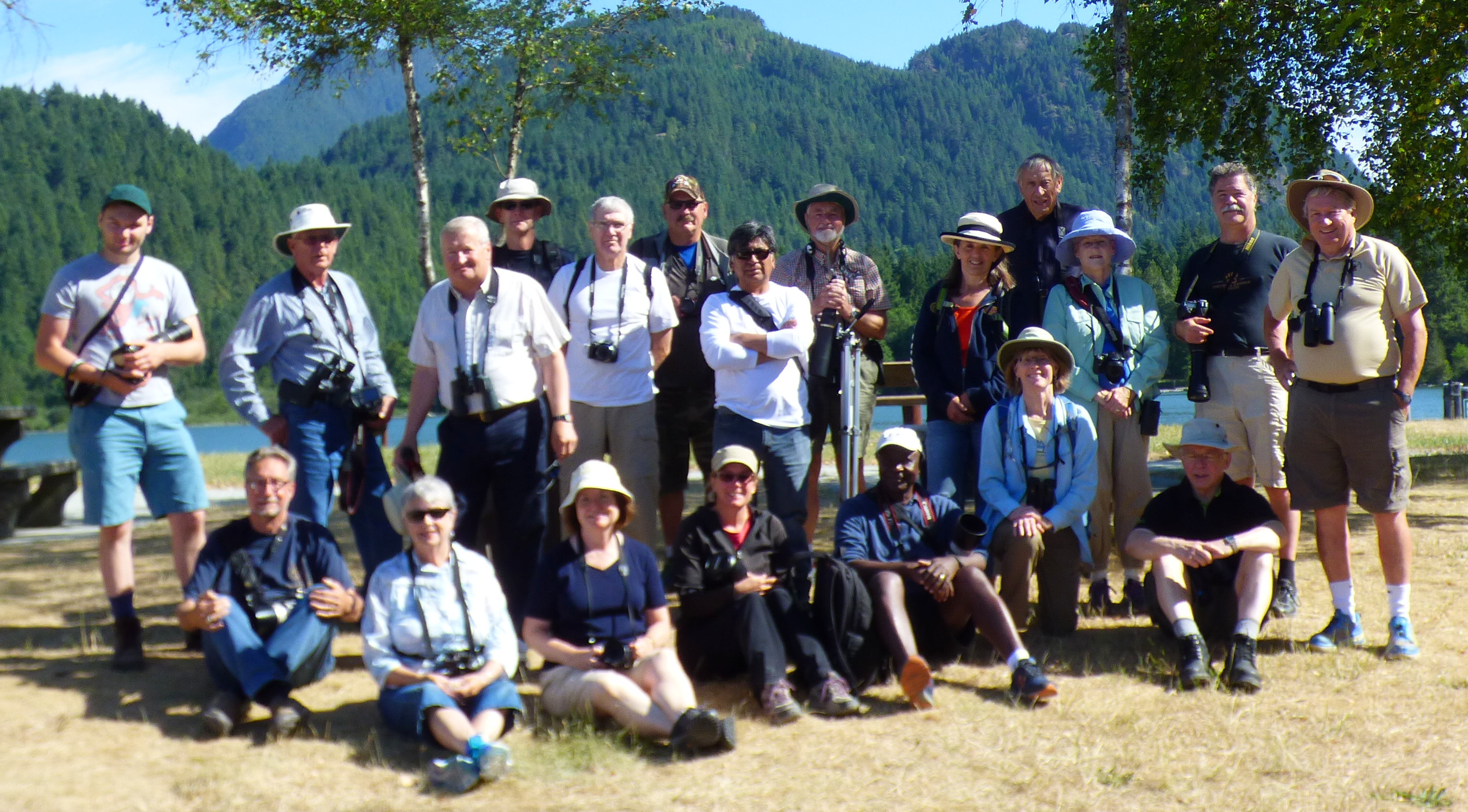 Nine of us left Petra’s at 7:30 a.m. in three cars. We followed the SFPR, some took the Golden Ears Bridge, others chose a longer convoluted way. It was almost 9:00 a.m. when we met Roger and the other DNCBers at the Catbird Slough. We joined them on the path around the slough and were thrilled to see several Eastern Kingbirds, Common Yellowthroats and brilliant Yellow Warblers, Cedar Waxwings and American Goldfinches. Some saw Gray Catbirds there, but late arrivers missed them. One brilliant DNCBer saw a couple of Western Tanagers which the inexperienced DNCBers missed. We drove on to the Grant Narrows parking lot, where we were scheduled to meet around 8:30 a.m. It was now 9:45 a.m. so Roger took the obligatory Group Photo (20). Sisters Pat and Maureen were not in the photo as they arrived at 8:00 a.m. and got tired of waiting for us so were wandering on their own.