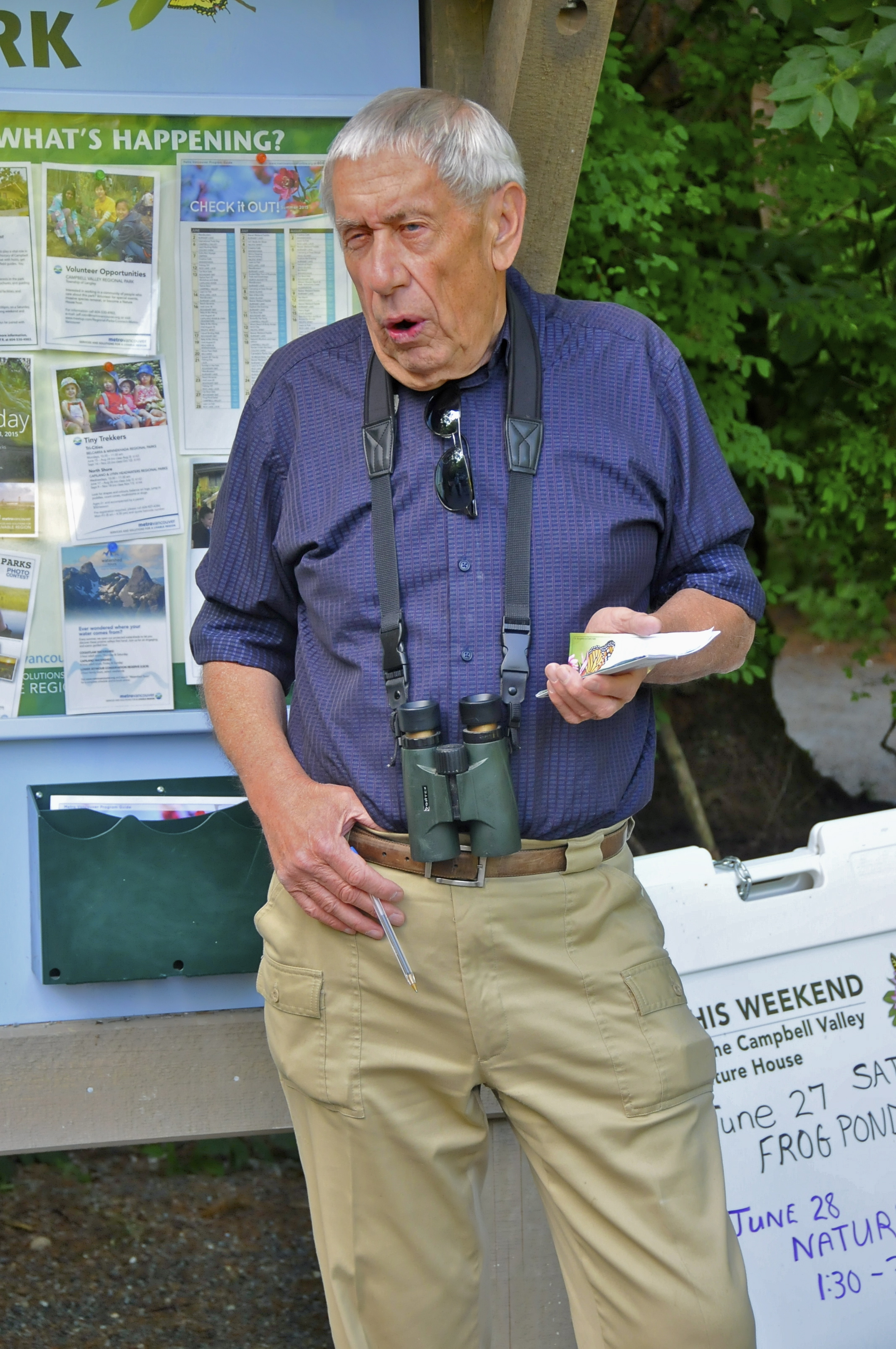 After about an hour on the narrow trail, we connected with the Little River Loop. There we promptly met up with latecomers Pascale and Alberto and dog walker in training, Wim, carrying Nelly, his new puppy; that brought the total to twenty five participants. Near and on the Listening Bridge, both male and female Black-headed Grosbeaks posed for great pictures, and snapshots of Yellow Warblers, Cedar Waxwings, Brown-headed Cowbirds as well as a Willow Flycatcher and a Steller’s Jay were also taken. Most members of the group walked through the open meadows to the historic Langley Speedway which was in operation from 1960 to the 1980s. Recently, an attempt was made to reopen the facility, but that failed because of strong opposition from environmentalists and area homeowners. When we walked through the track last July, a Disney movie was being filmed. Tom tried to convince the crew to engage our troop as extras but, alas, his request was denied.