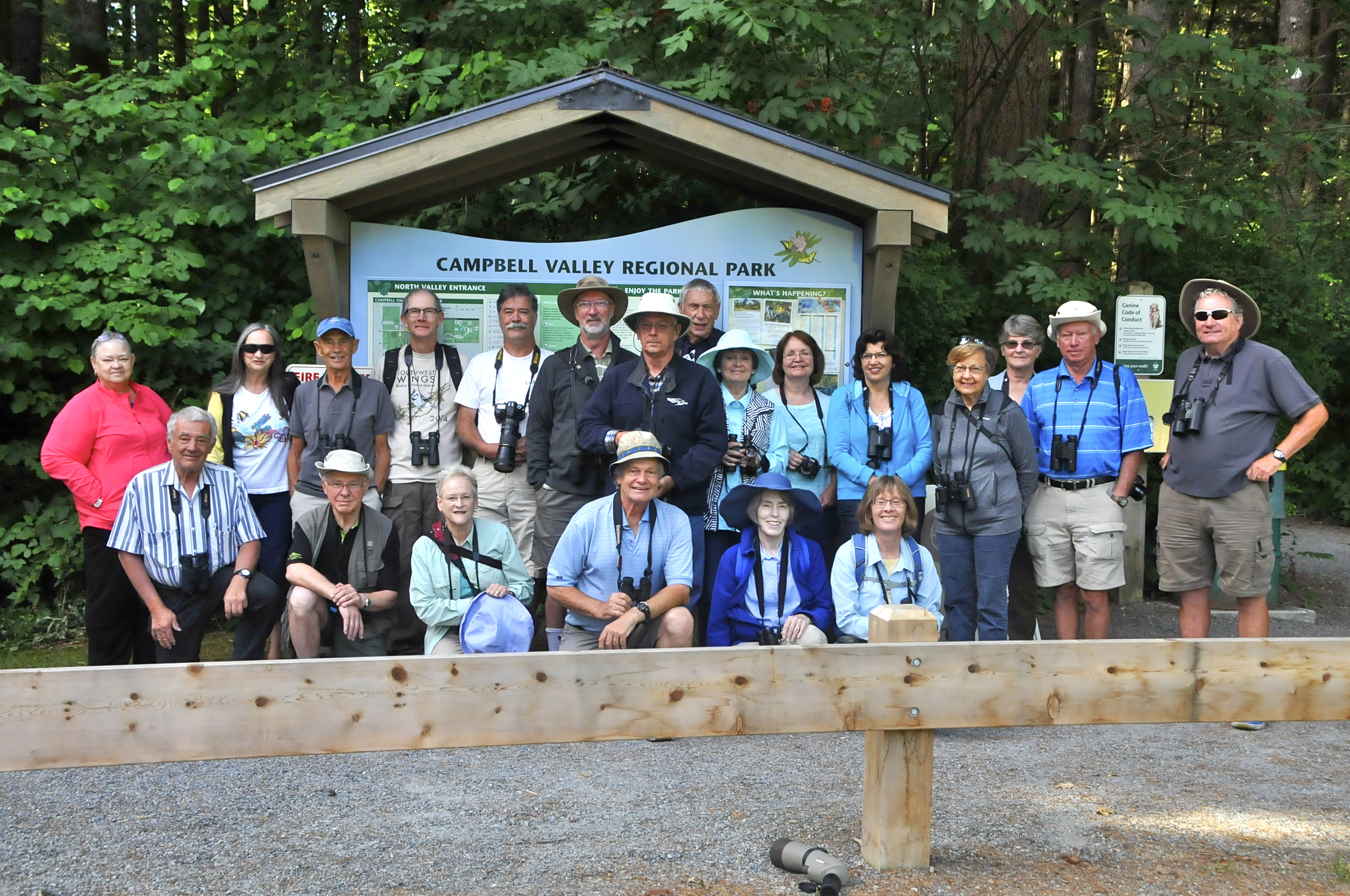 The group photo taken at the kiosk depicts the happy faces of sisters Pat and Maureen, Johnny Mac, Richmond Bill, Glen, Ladner Jack, Jim K, WR Al, PB Lorna, Liz, Langley Joanne, Marian, Pauline, Roger M, Tom, Gerhard, Hans, Marion, picture taker Ken with Anne, and Kirsten.