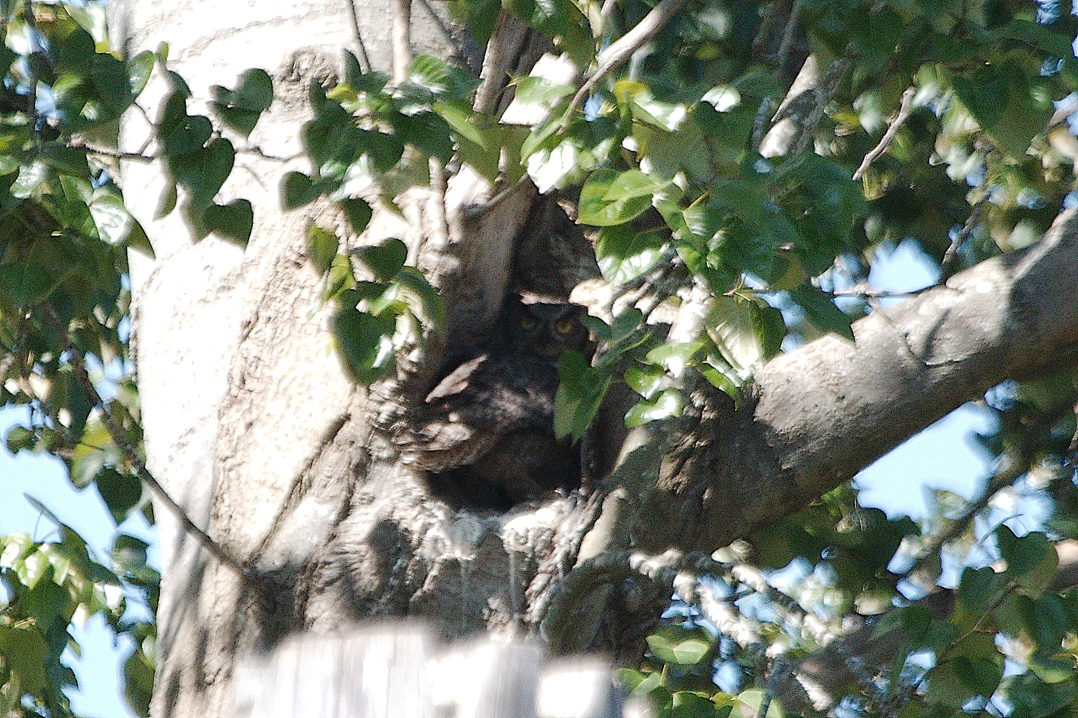 Now 11:30 a.m. a dozen (Baker’s dozen as Paula joined us late) of us decided to have lunch at the Rusty Anchor Pub, at the marina down the road. Another good decision as my Steak sandwich and two pints of Canadian were scrumptious, and Julie & Claire really looked after us. Following lunch, several came to my home at RiverWoods to check out the nesting Great-horned Owls. Bob & Claire welcomed us behind their home for good views of the two “fuzz balls” in the trunk cavity nest with Mom standing guard on a branch a meter away.