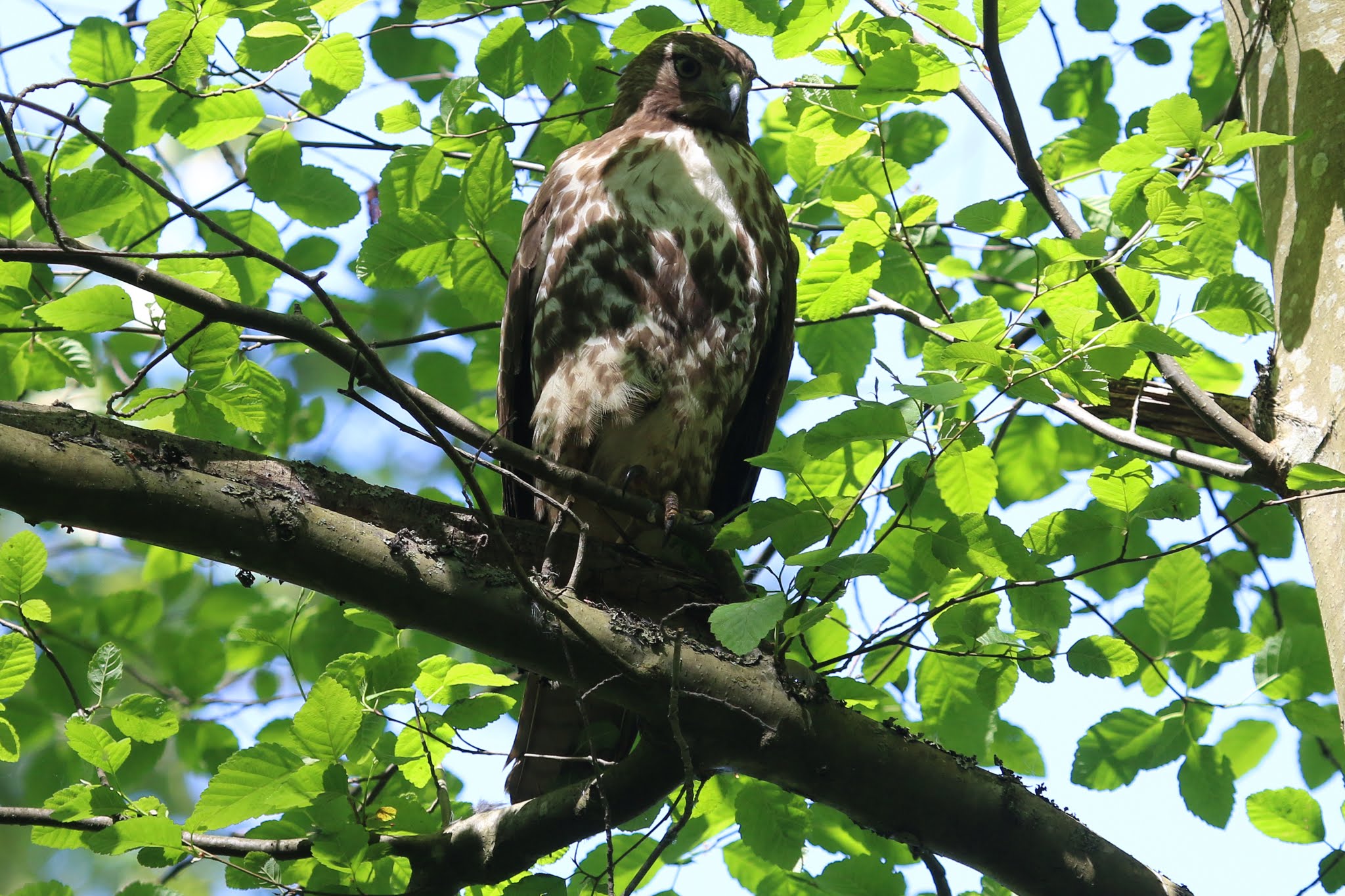 Also, a pair of stunning Common Mergansers and Green-winged Teal. Wandering back to the entrance, Jonathan spotted a juvenile Red-tailed Hawk roosting just above us on the trail.