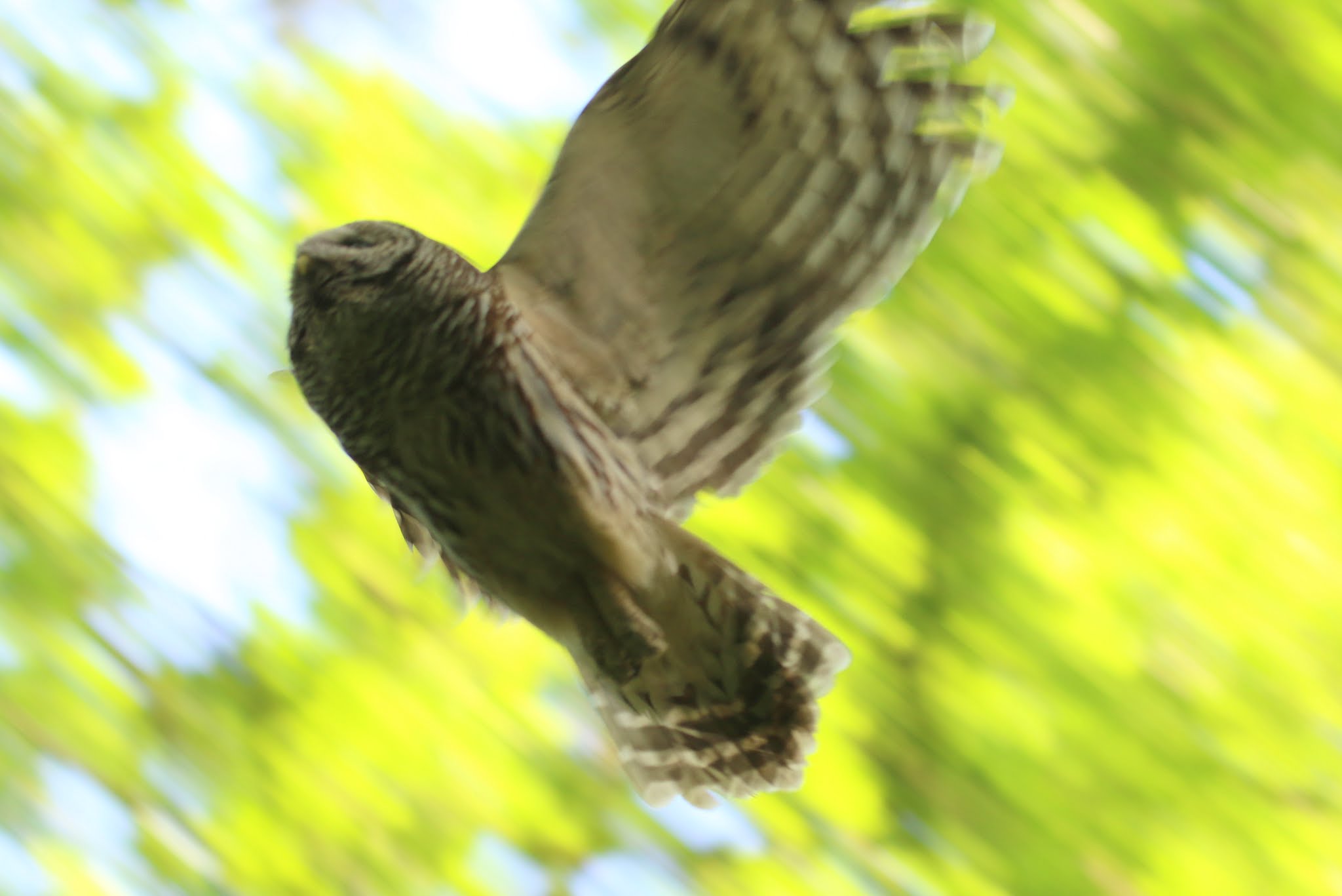 We walked back along a different trail, more Hummers, some brilliant American Goldfinches. As always, the group was very spread out. One splinter group took a wrong trail where, fortuitously, Ken spotted a Barred Owl roosting beside a tree trunk. We got excited and while many were fumbling for their cameras it flew off right over our heads. Terry was the only successful photog, getting a shot on the wing as it flew by.