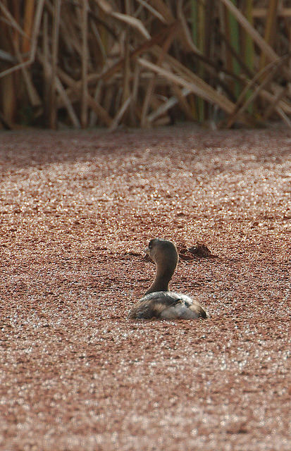 So, we started by walking through the play area and onto the boardwalk at the first pond which was covered completely with a brownish growth which turned out to be a small floating seed plant mixed in with the native green Duckweed. The closest invasive plant to fit the description I could find was Azolla japonica (I copied a photo from an on-line resource to our Flicker photos). A Pied-billed Grebe was mired in the middle of the stuff and wasn’t moving! Moving along we started to pick up a number of small birds including Golden-crowned, Fox and Song Sparrows, a few Ruby-crowned Kinglets, a flock of American Goldfinches, Spotted Towhees and the usual suspects… robins, starlings, and crows.