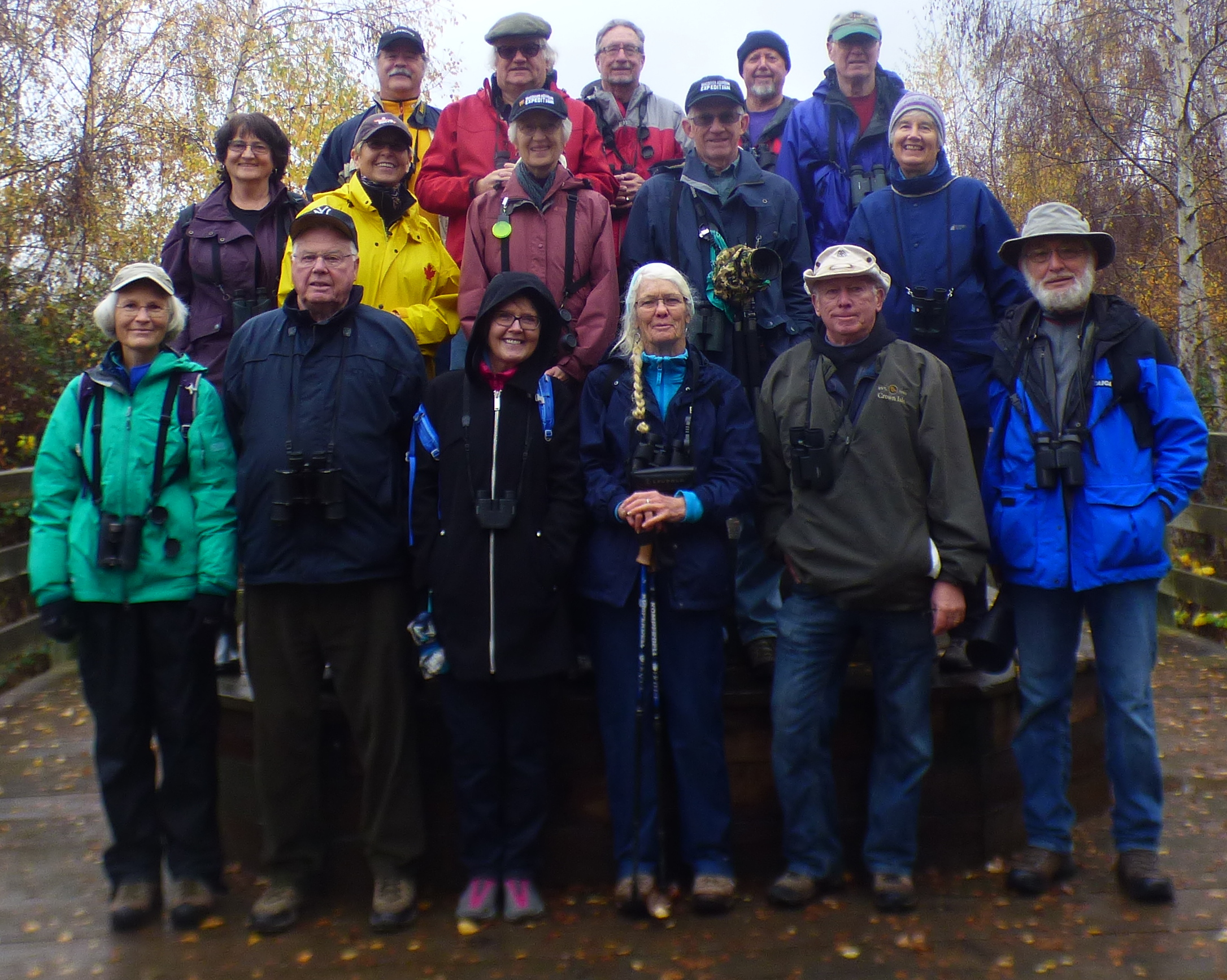 Brian A, being very familiar with the park, led us through the maze of trails and we ended up on Westminster Highway adjacent to the Community Gardens where we go for the annual Raptor Festival. Walking east along the road we entered the south portion of Terra Nova Park and followed the trails to the north boundary of the Quilchena Golf Course where we stopped at a raised platform surrounded by benches and had our obligatory group photo taken with members standing on it.