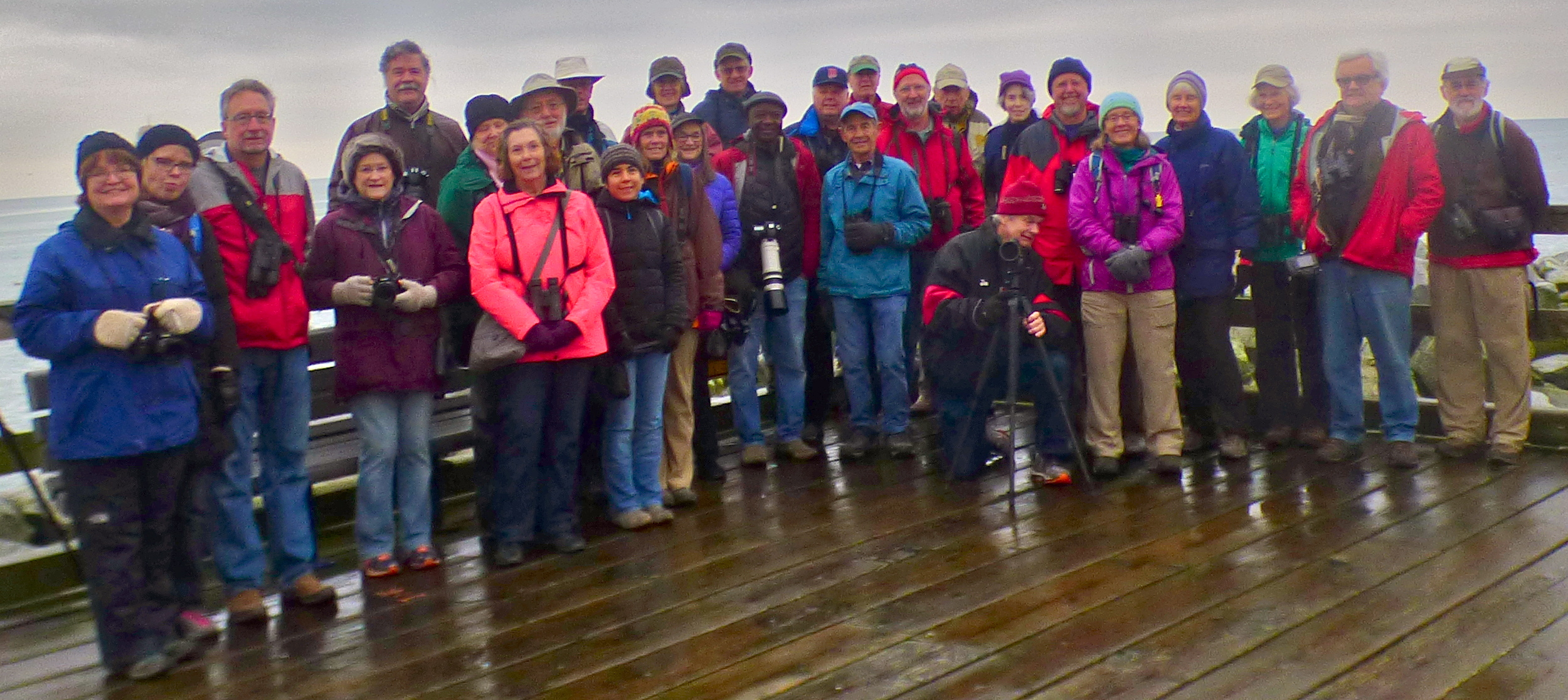 With a decent day forecast, at least to the afternoon, and a falling tide, the Petra’s group of 11 departed for the White Rock pier where we met with another 20 eager birders. We welcomed two Point Robert birders, Bobbie and Jamie, who had joined us previously at the Point and a few others we hadn’t seen for awhile like Johnnie Mac and Marti. Looking at the group photo and adding in the photographer, camera-phobic Maureen, and late comer Margaretha, it would seem that we had 32 in all… one of the largest we can remember!