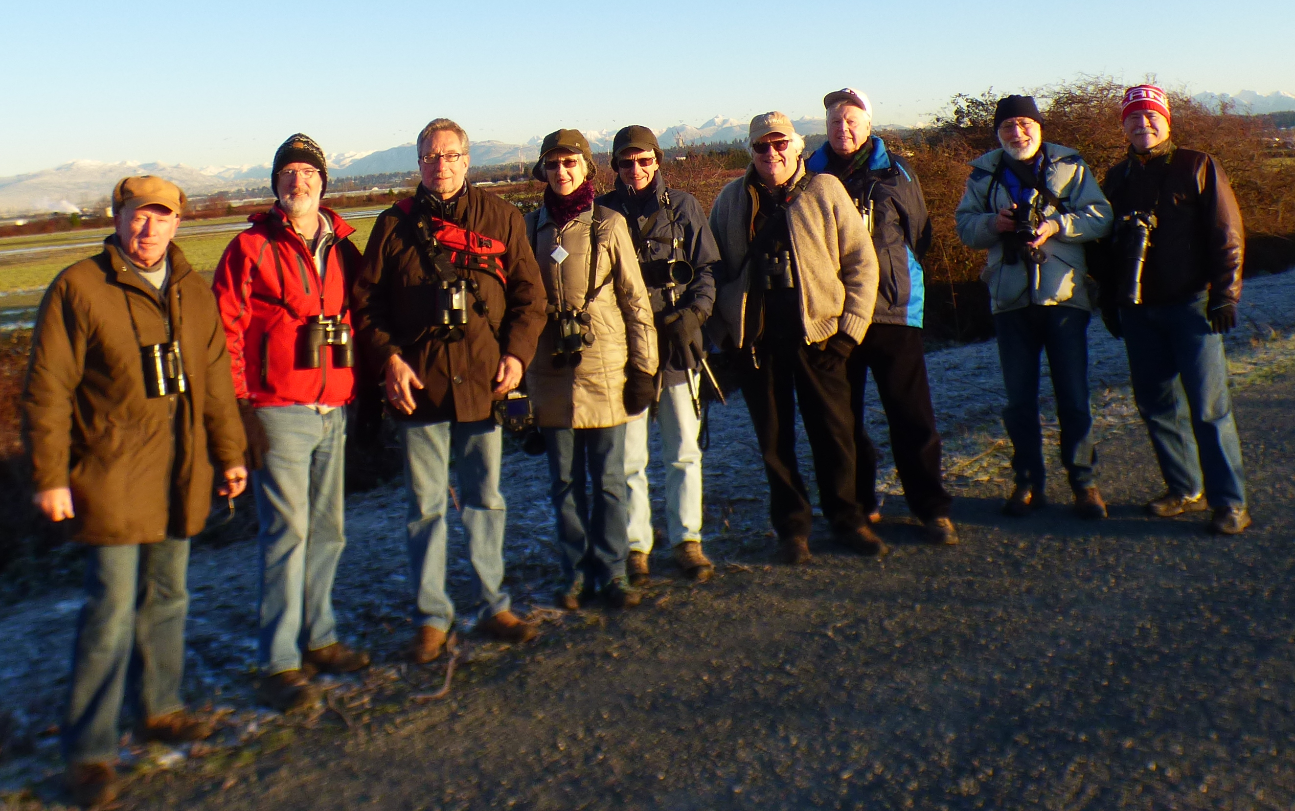 By daybreak the snow had abated, but the roads were icy and it took 20 minutes to clear the car windows. However, the main roads were clear and the sky cloudless and despite a –4 degree temperature, 7 birders, Mike, Terry, Glen, Chris, Roger (me), David and Noreen, appeared at Petra’s prepared to face the elements. We departed at 7:30 am for 104th Street and the Delta Heritage Air Park where we were joined at 8:00 by three other hardy members, Brian, Jack and Nance (who arrived an hour later after getting lost in the wilds of Surrey). There, we were treated to a beautiful sunrise and a panoramic view of the freshly snow-capped mountains.