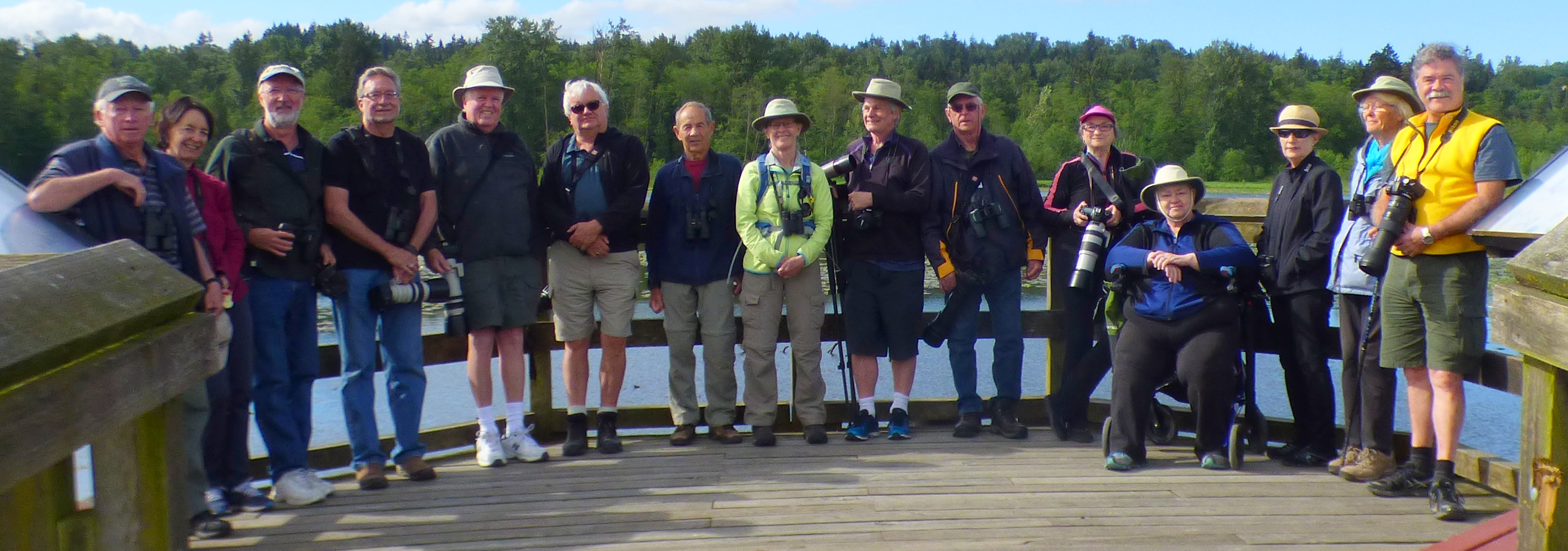 Some Red-winged Blackbirds were in the reeds on the shore and Barn, Violet-green, and Tree Swallows flew over the water. Roger took the group photo at the end of the pier. As we returned towards the Nature House, a Canada Goose revealed a clutch of eggs it was trying to hatch.
