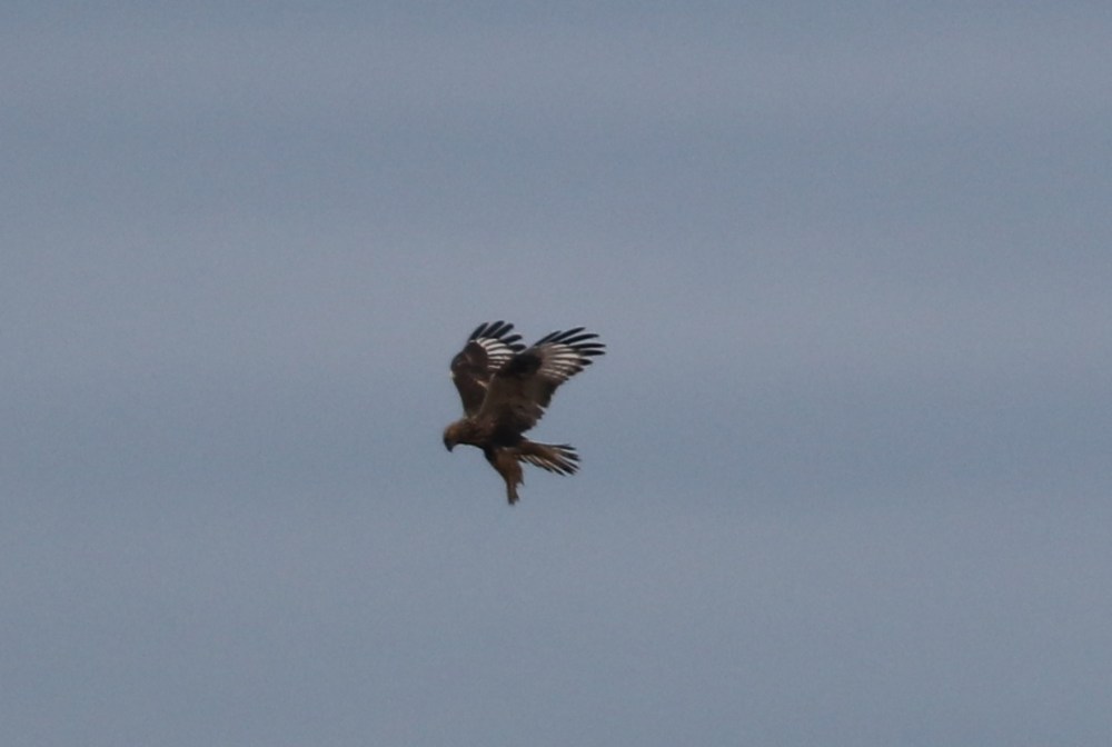 We steadily notched up species, however, as the Reserve began to wake up. A flock of little birds silhouetted in a tree against the grey sky caused us some identification problems, but eventually confirmed themselves as Pine Siskins. Some of the group climbed the tower for a view of a flock of Trumpeter Swans out on the marshes, but we all got a sight of them later from the west dyke. Roger M. was quick to spot a Rough-legged Hawk hovering over the reeds, a first for the year for most of us. This is one of my favourite raptors, and it was a super view, although it soon flew off and was later seen at a greater distance. Terry got photos of it, mid-hover, showing its dark and white plumage to perfection.