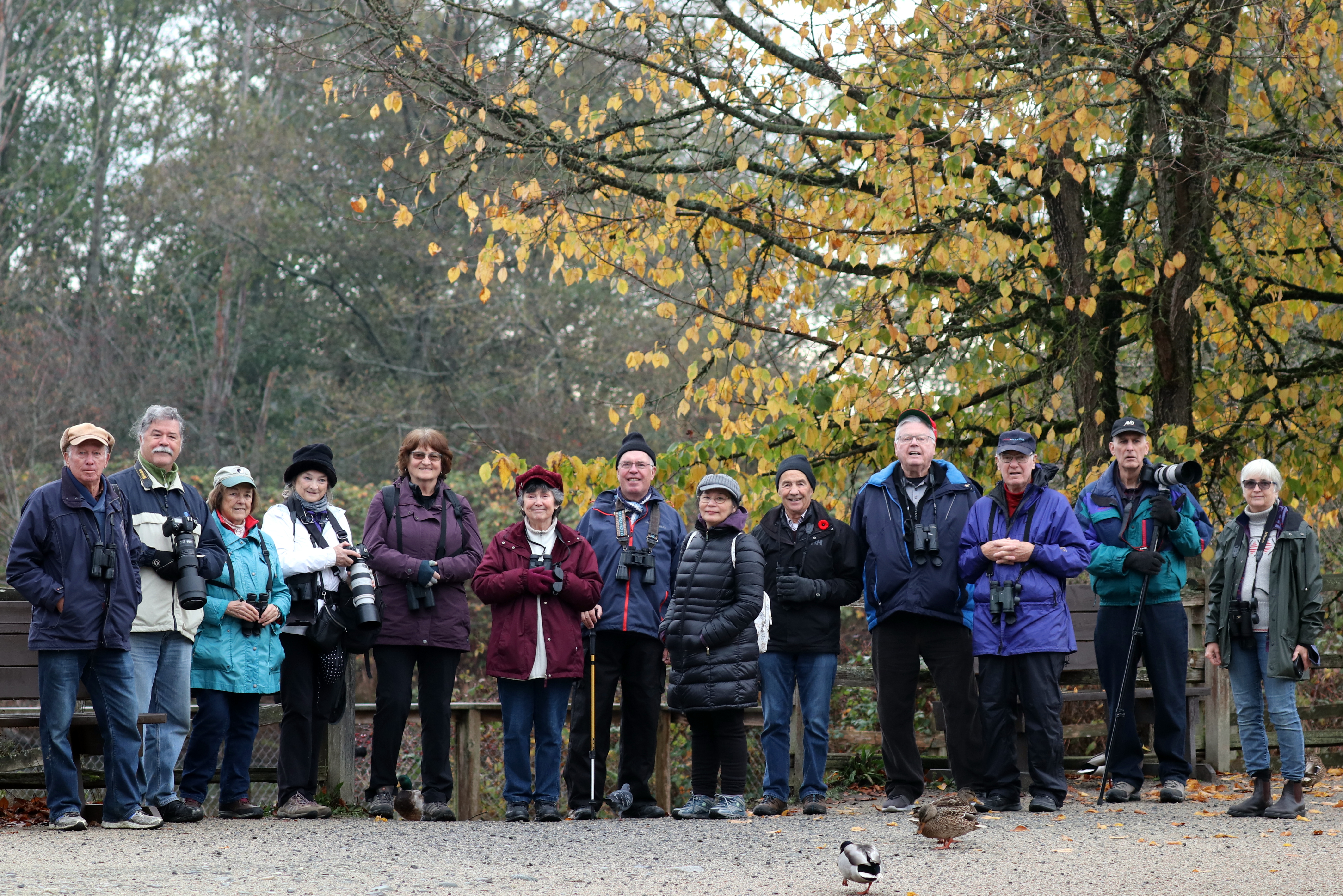 There were 14 of us for that part of the trip. Right at the shop entrance we enjoyed the sight of several Anna’s Hummingbirds buzzing around the feeders, undisturbed by the coolness of the weather. One Black-crowned Night-Heron was back on the usual tree, just before the slough, but the home pond was relatively quiet. We took a route up the north trail through the woods, with many hoping for owls, but we blanked this morning. The birds were as slow to wake up as some of us, even the chickadees were a bit half-hearted, and towhees and fox sparrows took awhile to emerge.