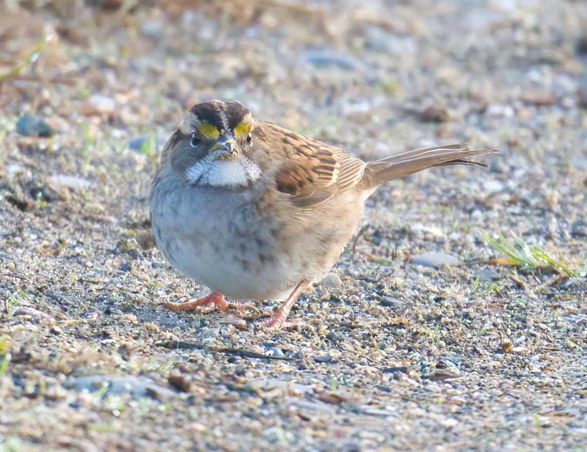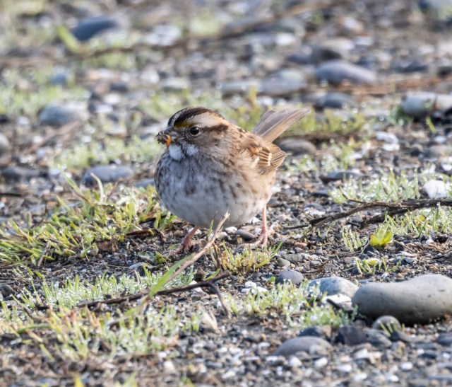 With the seaward side of the path yielding such a wondrous assortment of treasures, we kind of forgot to scan the bushes and field habitat on the landward side, which we only started doing well past the lighthouse. Once we did, however, the species list received a considerable boost. Black-capped Chickadees, Pacific Wrens, Song Sparrows, and a Fox Sparrow hunted the thickets, while Ruby-crowned Kinglets twitched about a pine tree. On the path ahead, Golden-crowned Sparrows, juvenile White-crowned Sparrows, and—drumroll please—White-throated Sparrows scuffed and pecked away in the gravel.