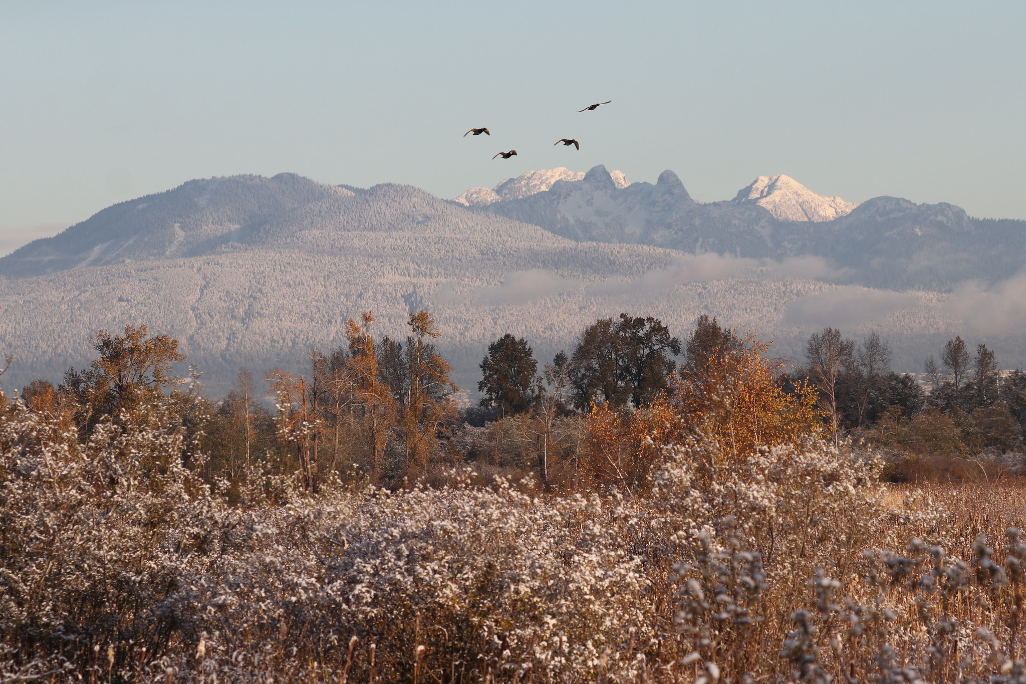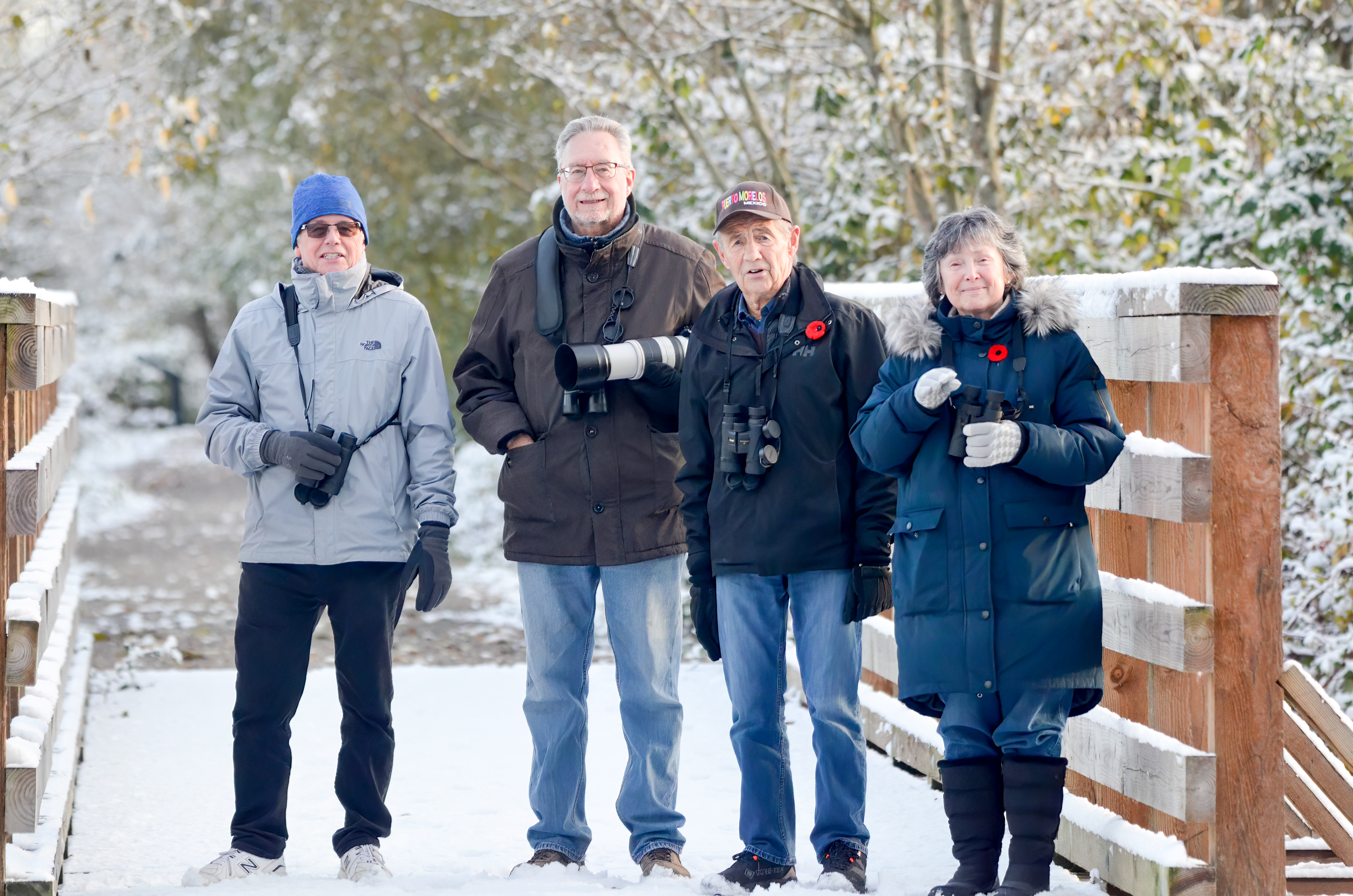 Six DNCBers met at Ladner Harbour Park on a cold sunny morning – Glen, Dirk, John, Bryan DeB, Lorna and Terry. A light dusting of snow overnight covered the branches with snow. This made for a very scenic walk.