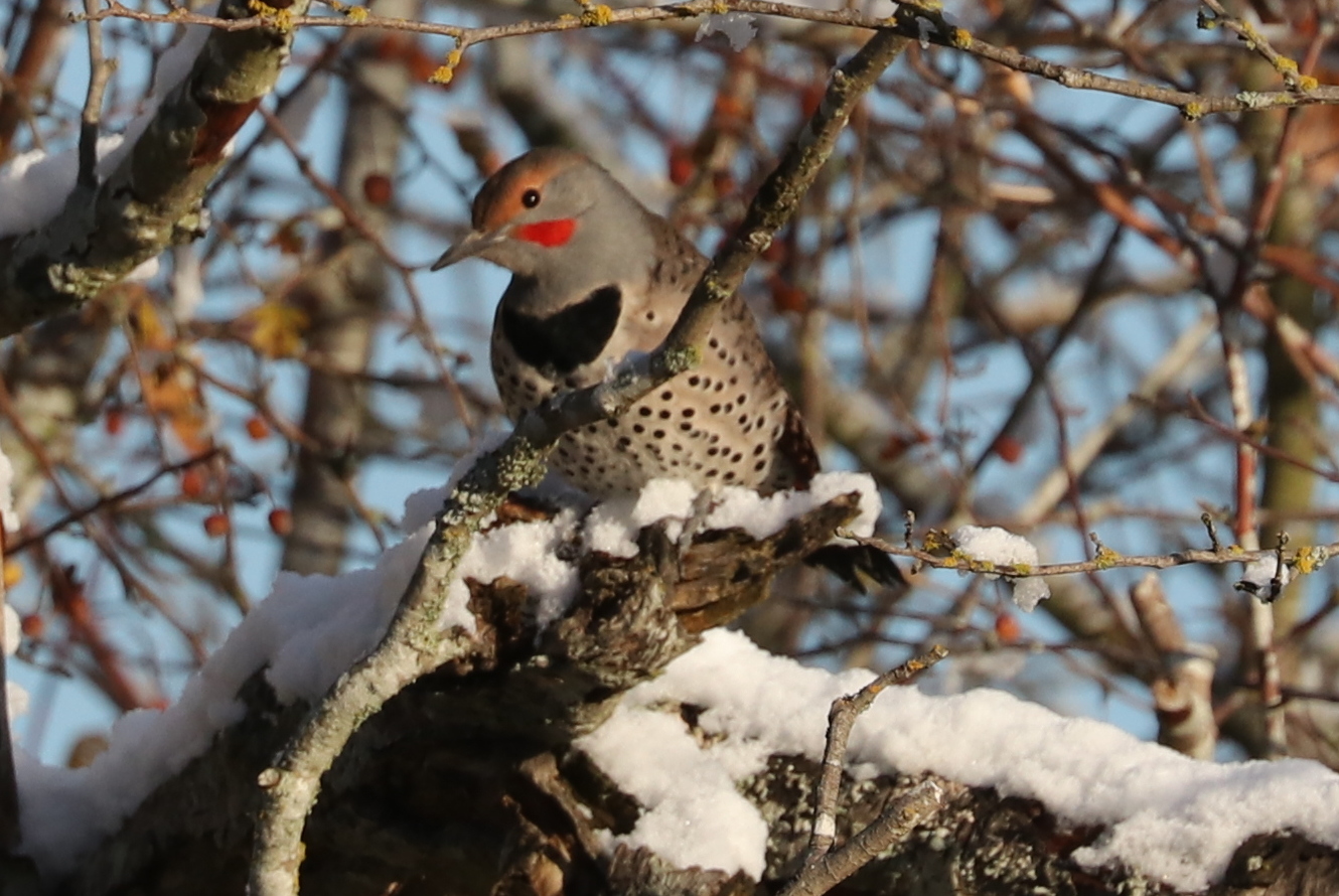 We started along the new path called Shirley’s Walk. From here we had good views of the snowy North Shore mountains beyond the snow-covered foliage. Along the way were Fox Sparrows, Song Sparrows, House Finches, Northern Flickers, American Robins and Marsh Wrens. There were flyovers from Mallards, Herons, Bald Eagles, Snow Geese and Trumpeter Swans. A Red-tailed Hawk was sitting in a distant tree.