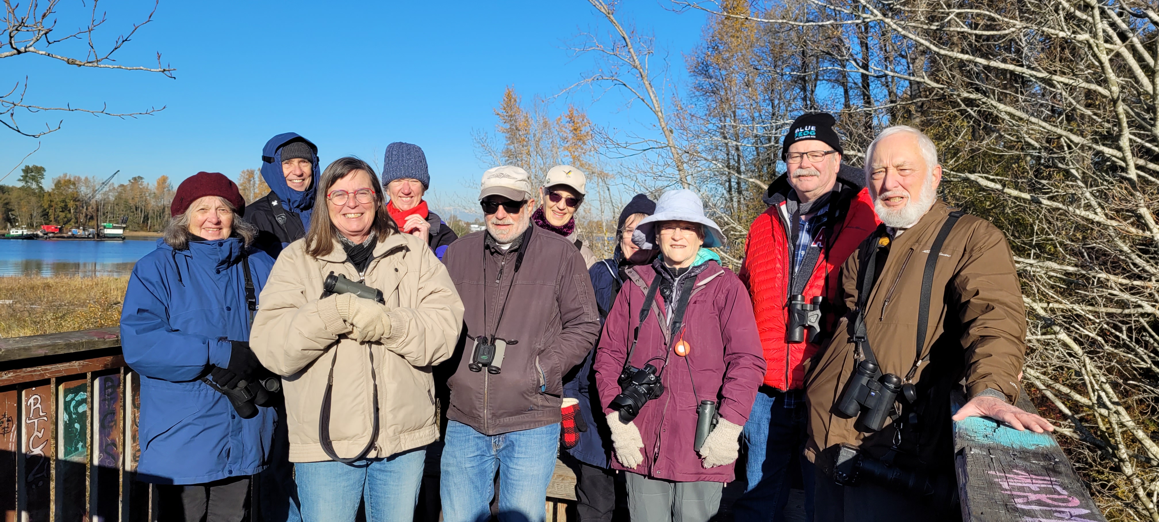 On a crisp and clear morning 12 of us gathered at Ladner Harbour Park in front of the caretaker’s house and watched the busy birds enjoying the full feeders. Many smaller regulars plus Northern Flickers and Downy Woodpeckers flitted between the front and back feeders. It was nice to see that the feeders are being filled, as it has been a while since we last noticed this. The DNCB group included Brian and Louise, Christine and Douglas, Dottie and Bob, Jacquie, Marion, Warren, Richard, Noreen and me (David).