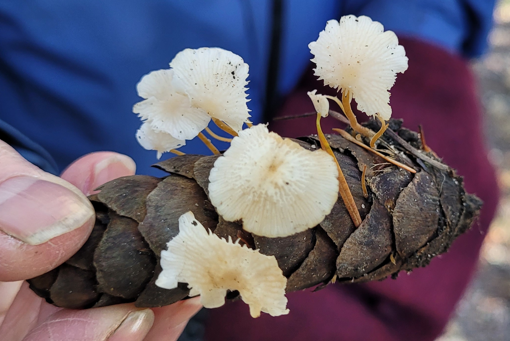 Marion wanted to see the Golden Scalycap mushrooms reported yesterday, and we walked to that slough trail where Jacquie picked up a beautiful example of Douglas Fir Cone mushrooms on their normal substrate, the Douglas Fir Cone.
