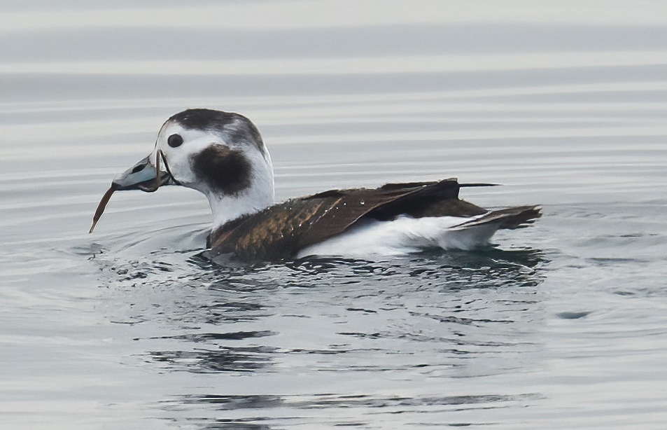 There were distant Common Goldeneye to the east and west, and several Common Loons and Horned Grebe. One walker reported seeing a Gull with a green band on its leg, but we were unable to find it. As we got farther out, some Black Turnstones were glimpsed on the west jetty but they disappeared and much later flew to the east jetty and peeked out from time to time from behind the rocks. Finally 5 Long-tailed Ducks, our target bird, flew past to the west, then a group of 3 to the east and as we were at the end a pair slowly moved past closer to the rock jetty where most got a good look. A Red-breasted Merganser flew past and a Red-necked Grebe was fishing off the end.