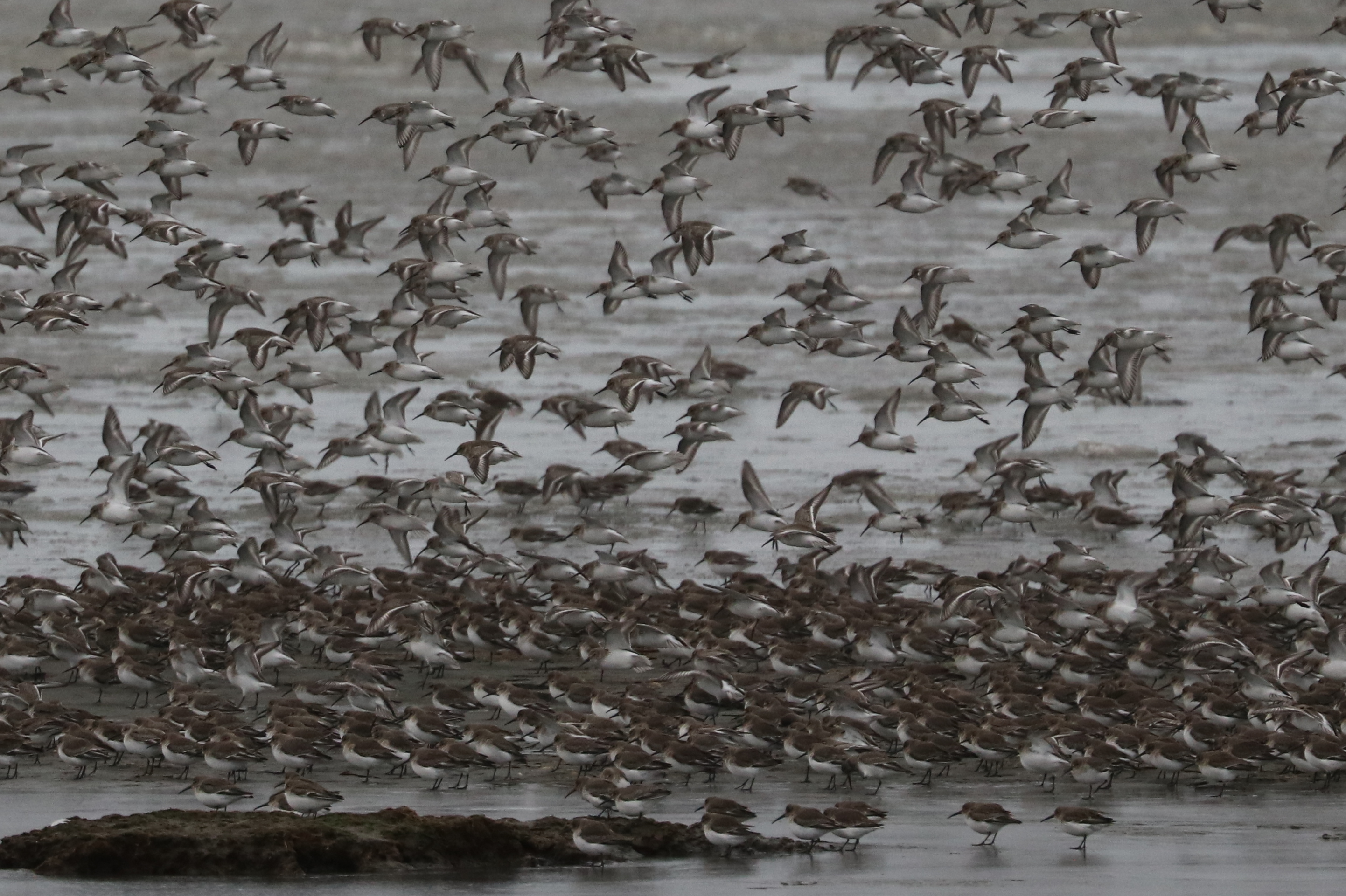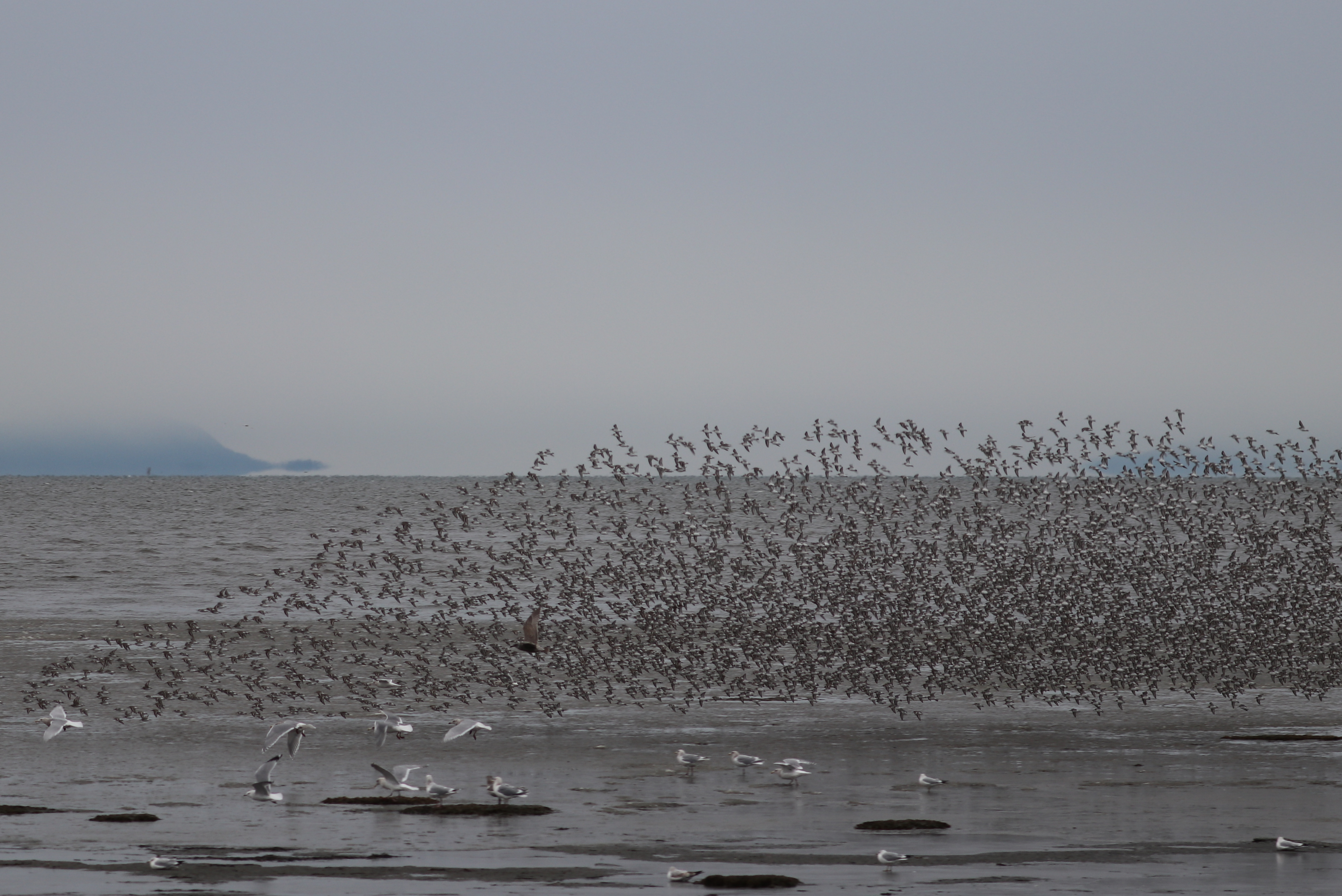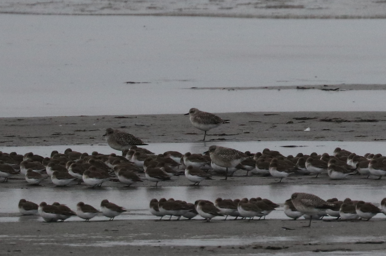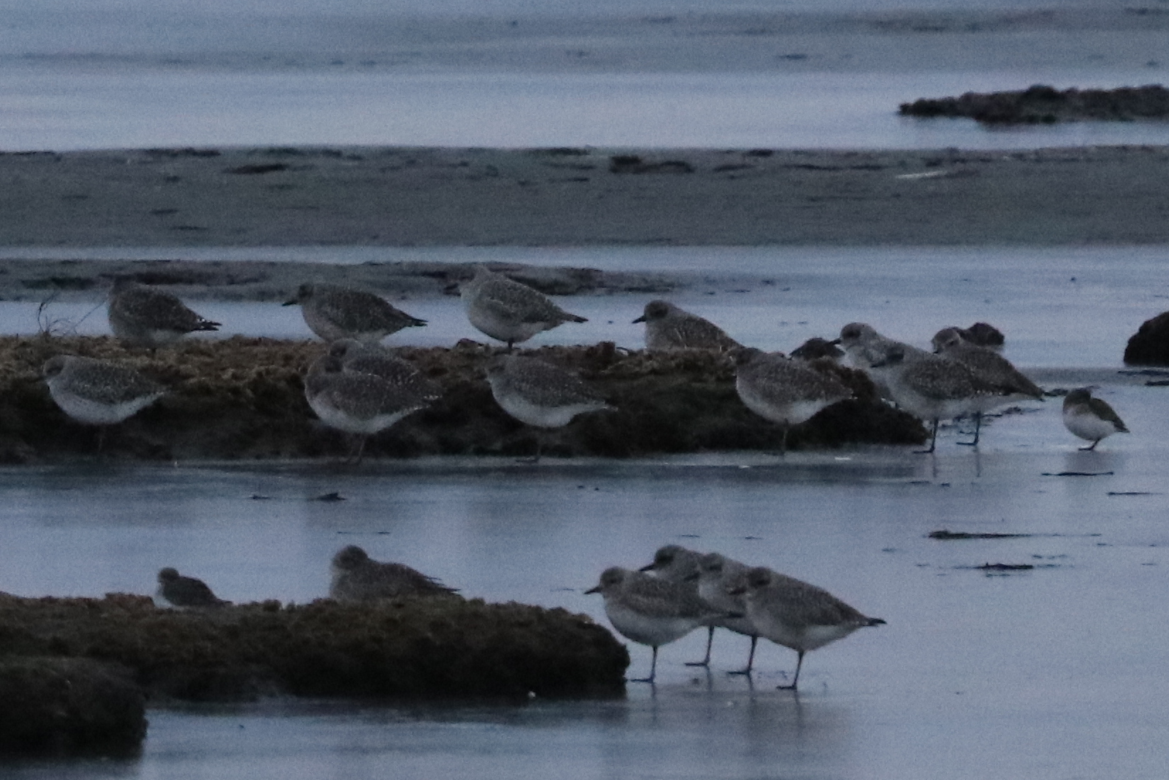 Seven DNCBers met at 104th Street at 8am on a very cold morning – Marion, John, Lidia, Colin, Stephanie, Lorna and Terry. We were here to watch the rising tide bring shorebids close to shore. Large flocks of gulls, ducks and shorebirds were still a long way out. A Northern Harrier flew by, and several Bald Eagles were watching and occasionally causing the flocks to move. There were Black-bellied Plovers, with their short bills and black armpits, and smaller Dunlin with their longer bills.