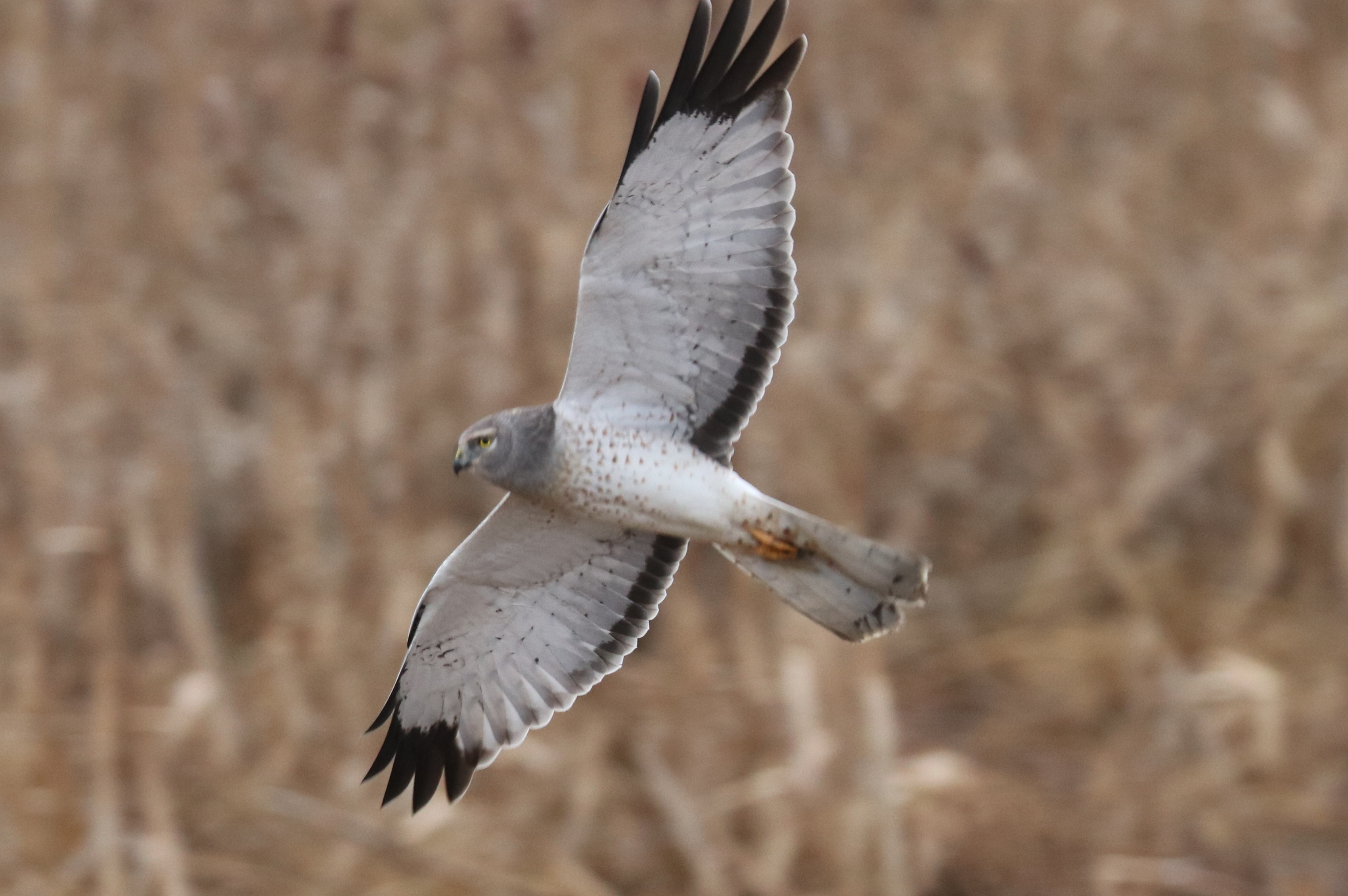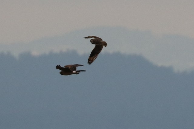 There were several Northern Harriers patrolling the area, including one light-coloured male that flew very close. Farther away a Short-eared Owl and a Northern Harrier were having a skirmish. A pair of Ravens were skirmishing too and photos showed that one of them was carrying a vole. There was a single Snow Goose in the field, and large flocks of them flying overhead.