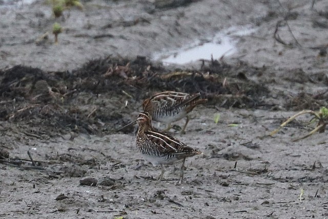Back at the first field, four Wilson’s Snipe flew in. They were so well camouflaged that it was hard to find them even when we knew where they were. This time they gave us a nice long look while they were foraging with a Killdeer.
