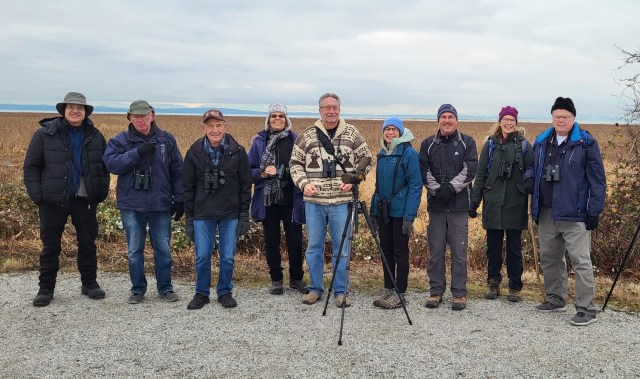 Ten DNCBers met at Brunswick Point on a cool, calm morning – Grant, Lee, John, Jim, Roger, Mike, Bryan D, Margareta, Lori and Terry. In the fields at the side of the road were Dunlin, Black-bellied Plovers, Mallards, White-crowned and Golden-crowned Sparrows. Lee saw a Tree Sparrow, but it disappeared before the rest of us saw it. A muskrat was swimming in the ditch through the field.