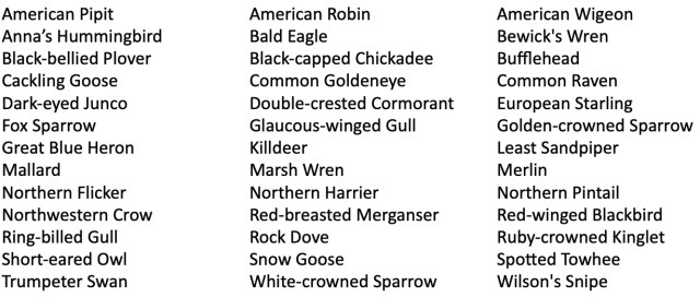 There was a flyover by a V of geese, which on closer inspection had very short bills, and were determined to be Cackling Geese. Off-shore in the surprisingly calm waters we saw Wigeon and Pintails, and a large number of Swans near the shoreline. When we returned to the riverside at the end of our walk, we finally saw a few more duck species in the river – Bufflehead, Goldeneye and Merganser.