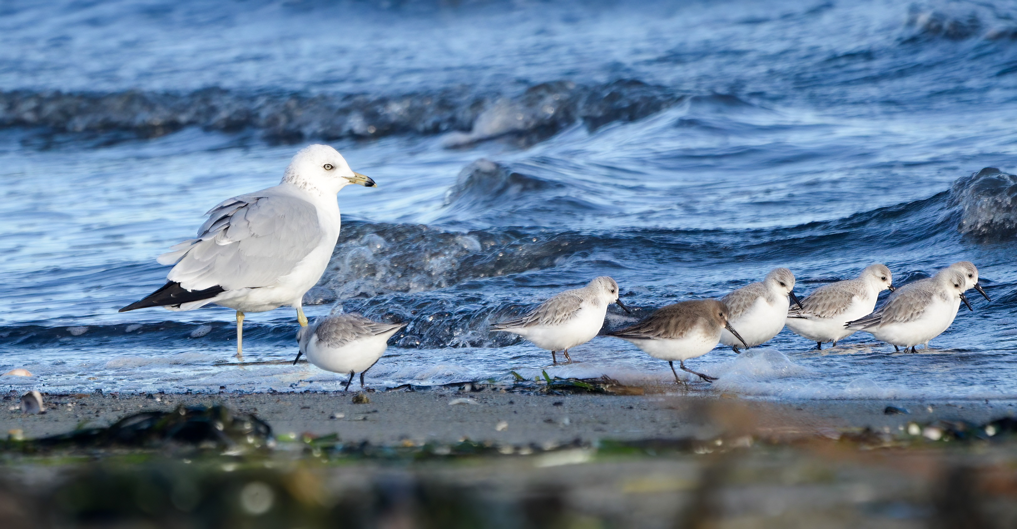 We walked along the beachside trail, marvelling at the total mess the recent snowstorms and high tides had made of the beach, trail and marsh. The park had to close for several days over the holidays as the trail had been washed and logs and branches were strewn everywhere. The boardwalk through the marsh was closed but the park staff had managed to roughly repair the main dyke trail. Walking north up the beach we encountered flocks of “peeps” (a nickname for some beautiful small shorebirds we have here in winter) – Sanderling and Dunlin. The flocks were not as large as sometimes, we estimated about 60 of each species. Most of the Dunlin, tens of thousands of which winter here, will have been elsewhere around the bay, but this beach is always a good one for Sanderling.