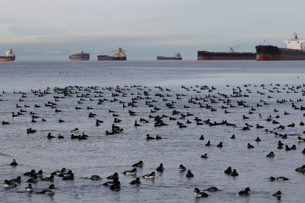 We walked along the seawall toward Third Beach where we could see hundreds of Barrow’s Goldeneye and Surf Scoters close to the shore. Something under the water seemed to be disturbing them, and groups would separate and re-form and separate again. It was an amazing sight! It was especially entertaining to watch the Scoters come in for a landing.