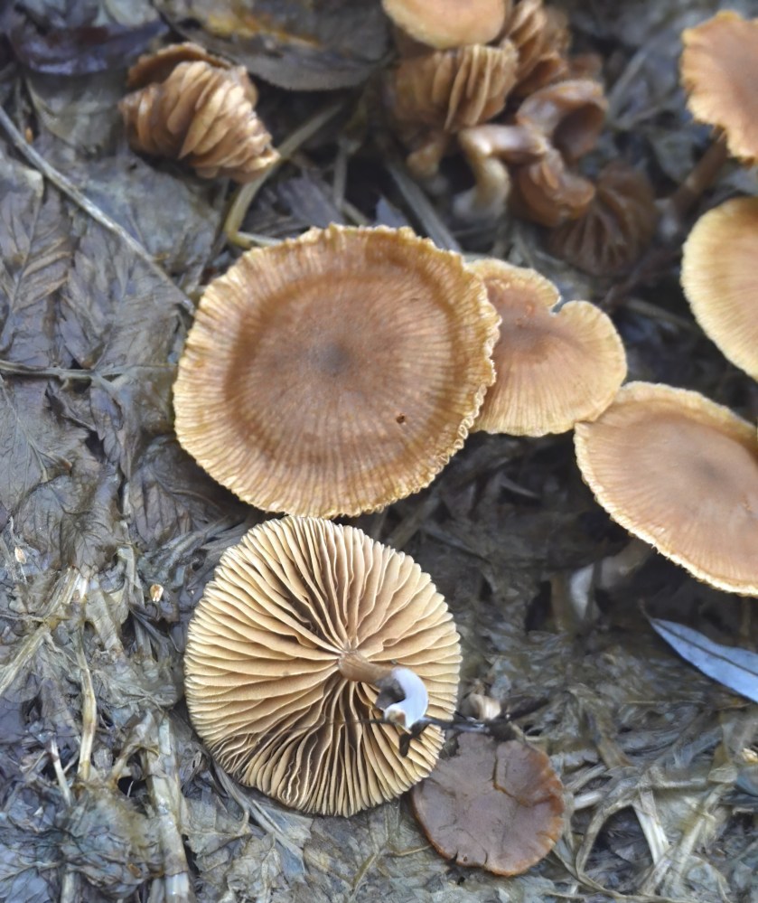 Circling back past the washrooms, there were only Mallards in the swimming pool, and we headed to the stream trail leading to Lost Lagoon. The large patch of mushrooms Terry had noted from Tuesday where a stump had been ground out got a careful scrutiny by Glen (who collected one for a spore print – possibly Tubaria sp.) and from the close by wooden bridge we could see Mallards, Wood Duck and two female Hooded Mergansers in the open water downstream of the beaver dam. More Wood Duck, Mallards, and a Pied-billed Grebe were below the stone bridge, and a small mixed flight of Golden-crowned Kinglet, Black-capped Chickadee, Dark-eyed Junco and Spotted Towhee greeted us as we headed along the shore to the next wooden bridge.