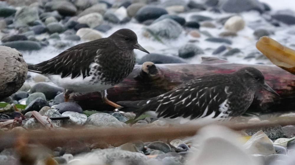 A group of Black Turnstones and one Sanderling were feeding along the shore. The very rough water meant that few birds were visible on the water. There were Horned Grebes, Common Goldeneye, Surf Scoters, Red-breasted Mergansers, one Common Loon and one female Harlequin. There were flybys by Double-crested and Pelagic Cormorants, Bald Eagles, Brant, and a single Long-tailed Duck. After walking along the shore, we headed out of the wind onto the inland paths. But all the songbirds must have been hunkered down because we did not see a single one on our walk back to the cars.