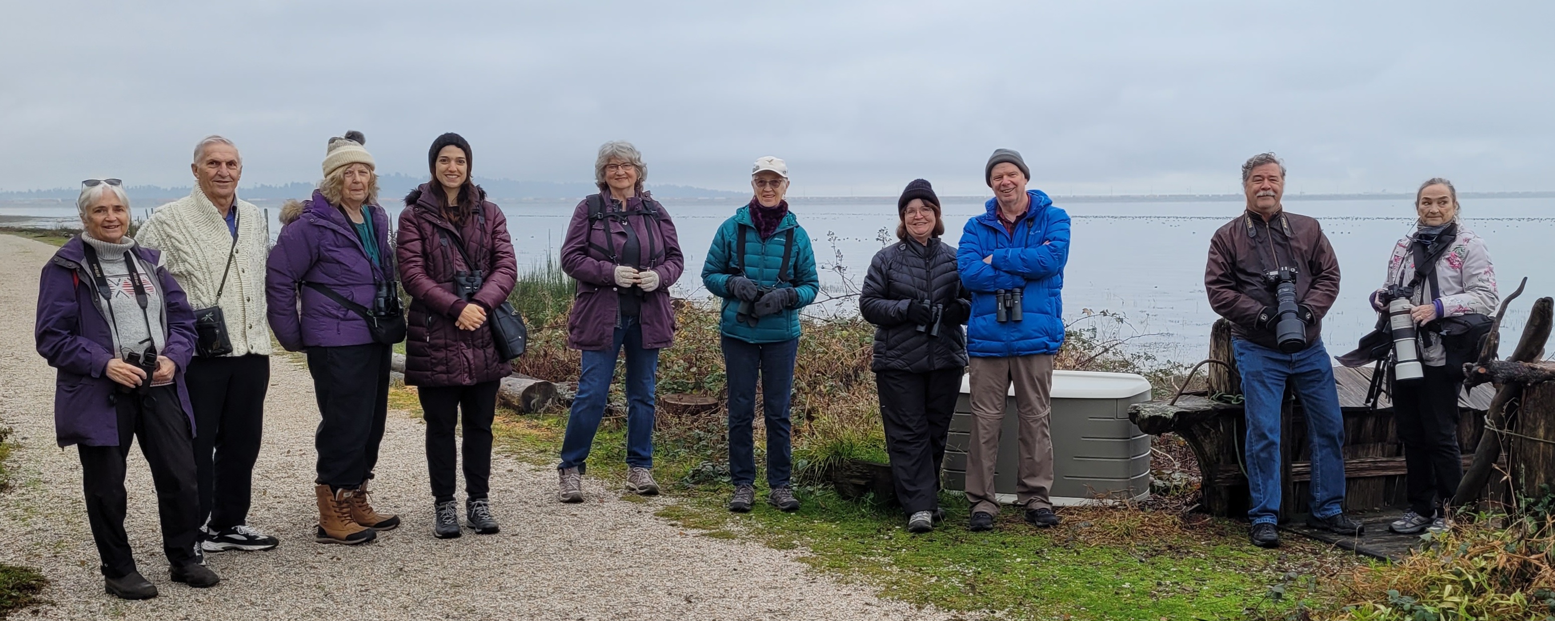 It was a little more overcast / misty / damp than expected, but not enough to keep Thea, Rosemary, Richard, David, Noreen, Liz, Alan, Anne, Lidia, Pat and Glen off the trail. The greater barrier was the extra kilometer to walk at the start of the route, and again at the end! Thanks Delta! The Fraser was completely still as we arrived with no ripples, and no birds except a few Trumpeter Swans at the far shoreline and a wishful guess of maybe a Red-throated Loon.
