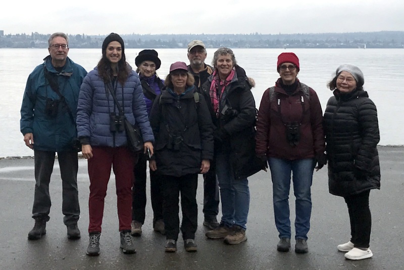 The sun may have been firmly behind the clouds but the weather was truly fine—mild and not a breath of wind—for a Wednesday outing to Stanley Park. Eight Delta Nats Thea, Terry, Nicki, Christine, Colin, Stephanie, Pat, and Manli met on the seawall below the Second Beach pool, where a large mixed flock of Surf Scoter, Common Goldeneye, Barrow’s Goldeneye, and Bufflehead paddled and dove close enough to the shore to afford us fabulous views of their striking markings.