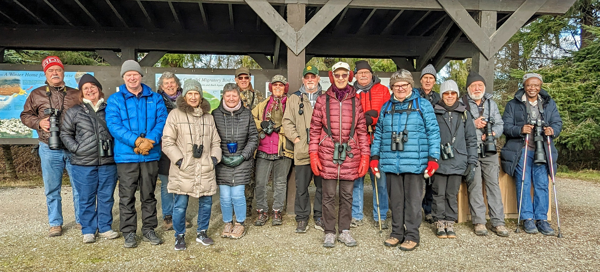 Once at Reifel, most of us first walked back along the entrance road to look for Great Horned Owls said to be roosting in a tree. They were there, but very hard to see clearly. We moved on into Reifel past the hummingbird feeders (lots of Anna’s), the main pond (a surprising number of Northern Shovelers) and through the marauding Mallards, Wigeon and Red-winged Blackbirds. One Black-crowned Night-Heron was in the regular roost. At the first lookout over London Slough we started counting Great Blue Herons …18. Don’t worry, we saw LOTS more later! Louise took the group picture with everyone there (except Nick, sorry).
