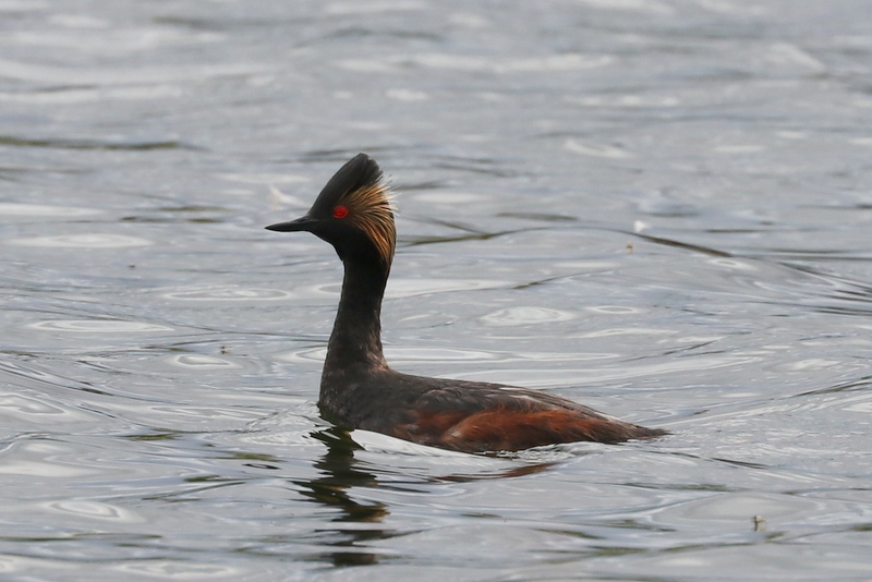 The lake was teeming with waterfowl and their recently hatched chicks. We added Northern Shoveler, Bufflehead, Common Goldeneye, Cinnamon Teal, and Redhead to the master trip list. A female Bufflehead paddled around with her brood of nine babies: tiny cotton balls with striking black caps and white cheeks. American Coot were also flush with gorgeous fluffy chicks with striking candy-red bills, eliciting all kinds of “coos” and gooey sentiments from (mostly) the ladies in our group. Blue-winged Teal hung out in pairs and Eared Grebe dove constantly, hunting the water column for algae and other morsels.
