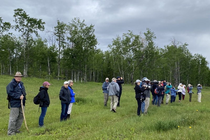 As we trekked along the flank of Watson Creek, which expanded into a fairly wide waterway, Sora became particularly vociferous and, at one section where the reeds opened to reveal a few puddles of water, one was seen foraging out in the open. On the lake were numerous Northern Shoveler, Lesser Scaup, Ruddy Duck, American Wigeon, and Gadwall, with lesser numbers of Eared Grebe and the three teal species: Cinnamon, Blue-winged, and Green-winged Teal. As with Elliot Lake, Bufflehead were present with enormous broods of chicks (we counted 15 with one mother). Alas, we struck out on the hoped-for Wilson’s Phalarope.