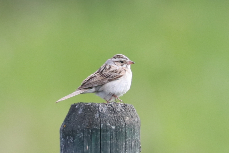 Further on, as we approached pastureland, we heard Willow Flycatcher, set against the ever-present backing track of noisy Red-winged and Yellow-headed Blackbird. But then, Paul teased out the call of what became the “bird of the outing” for many: Clay-coloured Sparrow! And to our greatest delight, this grassland sparrow decided to perch on a wooden fence, creamy chest puffed out, and bask in the morning sunlight, affording us a long, leisurely view of this lifer for many and a once-in-a-decade bird for others. (As it turns out, Clay-coloured Sparrow are far from rare in this part of BC and we would see them many more times on our trip.)