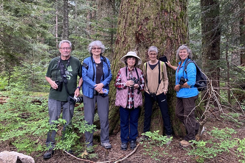 Our next stop was the downhill parking area for the walk to Yew Lake. As well as the gravity-powered luge ride, an axe throwing concession has been added. Needless to say we avoided those. Here we added Pine Siskins, White-crowned Sparrows, Chickadees, Swallows, Mallard, Steller’s Jays and Flickers. We heard and then saw an Olive-sided Flycatcher sitting on a high treetop. We heard the drumming of a Grouse and the tapping of woodpeckers. There were lots of neat small sapsucker holes – but the birds did not appear. There were many flowers and insects to upload to iNaturalist for identification, and massive hemlock trees with massive fungi attached.