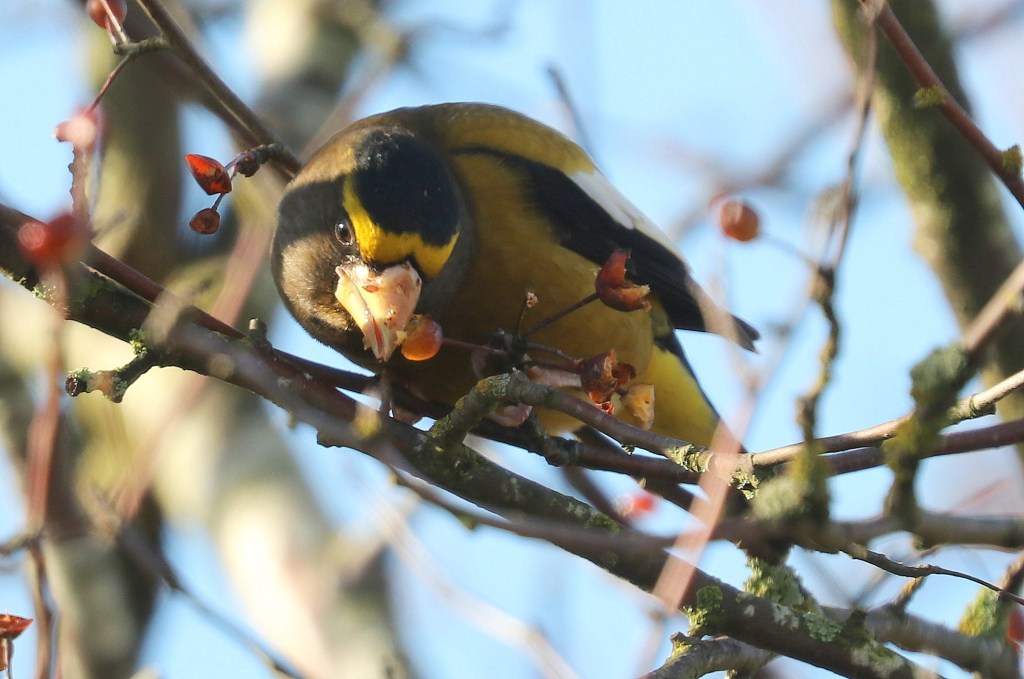 From the third viewing tower we saw more of the same ducks, including another Eurasian Wigeon. The highlight of the last leg was a single Evening Grosbeak gorging on crabapples.
