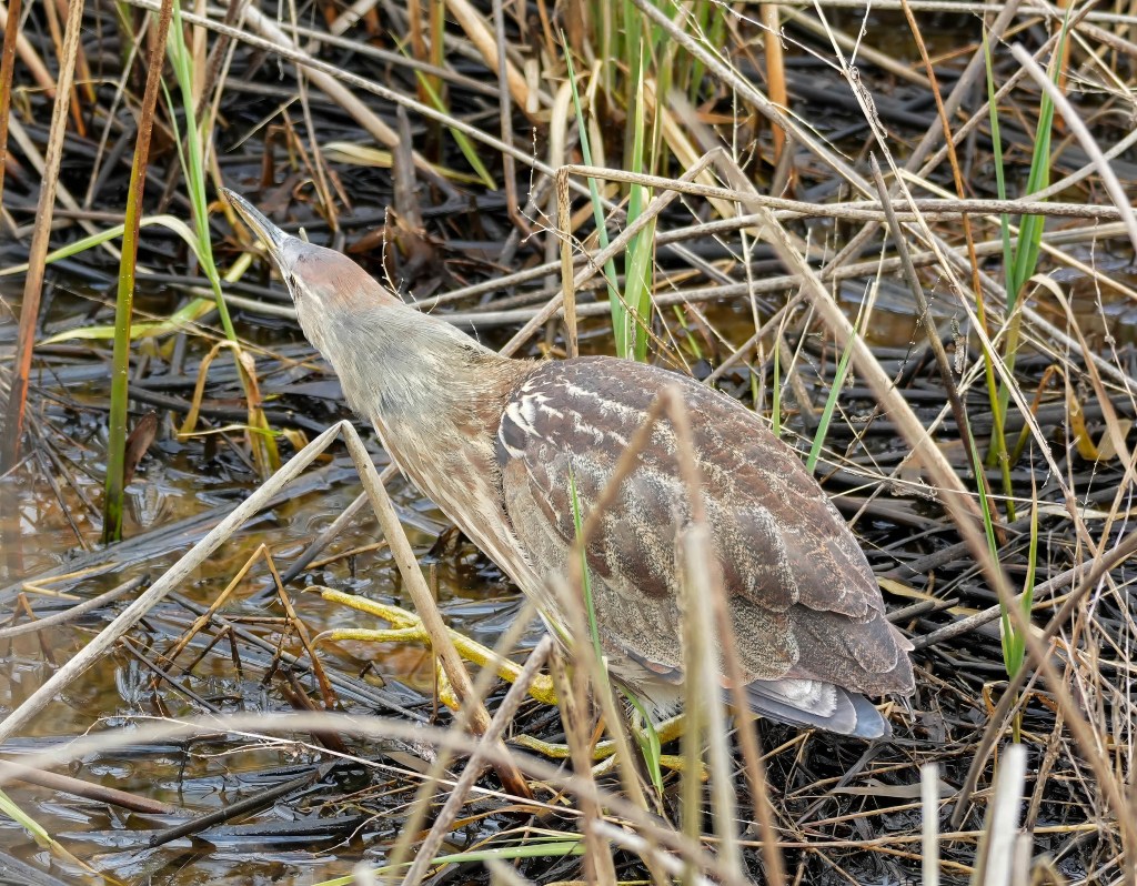 We continued around on the Outer Dyke trail. There were Northern Harriers patrolling the marsh, a Peregrine flew quickly past overhead, Marsh Wrens were in the bushes practicing their calls for spring mating, more Northern Shovelers dabbled in the Ponds and out in the marsh, sitting on some logs were about 11 Great Blue Herons. Along the SW edge of the ponds we had been told to look out for the Bittern “right where the sign is”. Knowing it was great at camouflage ,we slowed right down and scanned the area carefully, finally finding it moving slowly through the reeds. Where we expected a larger bird with a vertical posture, we saw a smaller bird with a very horizontal posture. It quickly snatched something off the ground, but I don’t think we got a picture of it, and then it disappeared back into the reeds.