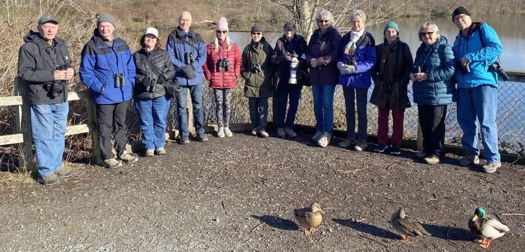At Reifel Bird Sanctuary we met Jim, Alan & Liz, Doug & Christine M, Joni, Susan, Lidia, Warren & Lynne and Margaretha – bringing our group to 14. The 3 Sandhill Cranes were foraging near the house. Later they were near the centre ponds. Anna’s Hummingbirds and Red-winged Blackbirds were at the feeders. We could not find the Black-crowned Night Herons in their usual trees. They are usually at Reifel from September to April. The usual collection of Mallards and American Wigeon were on the path – the green on the heads of the males was shimmering in the sunlight. The most common ducks in the ponds were Northern Shovelers and Gadwall. The Gadwall were upending like Pintails. There were also Wood Ducks, Bufflehead, Hooded Mergansers, Northern Pintails, Green-winged Teal, Common Merganser, Scaup, Ring-necked Duck, Coots, Canada Geese, and a Pied-billed Grebe.
