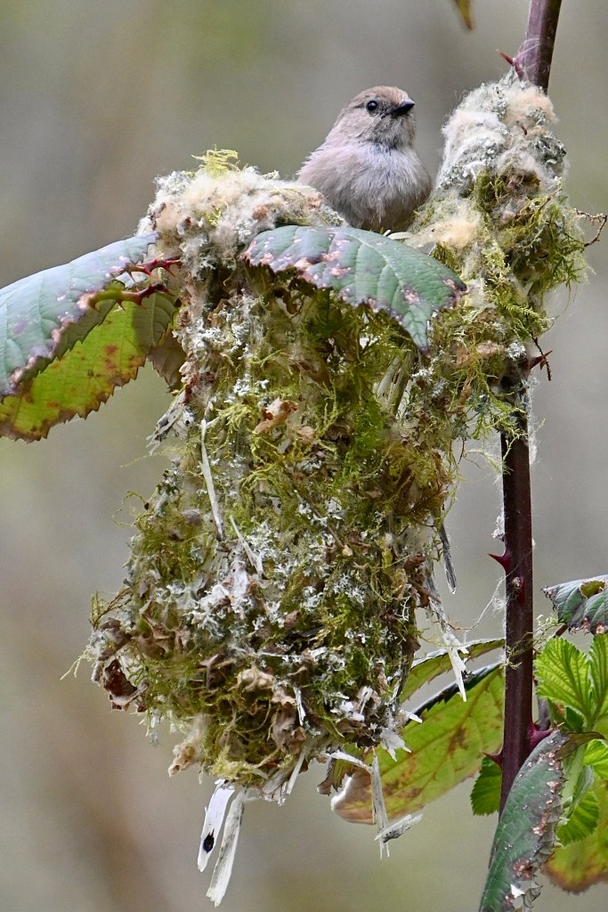 Lee had found Bushtits making a nest, and Christine went back to it for photos.