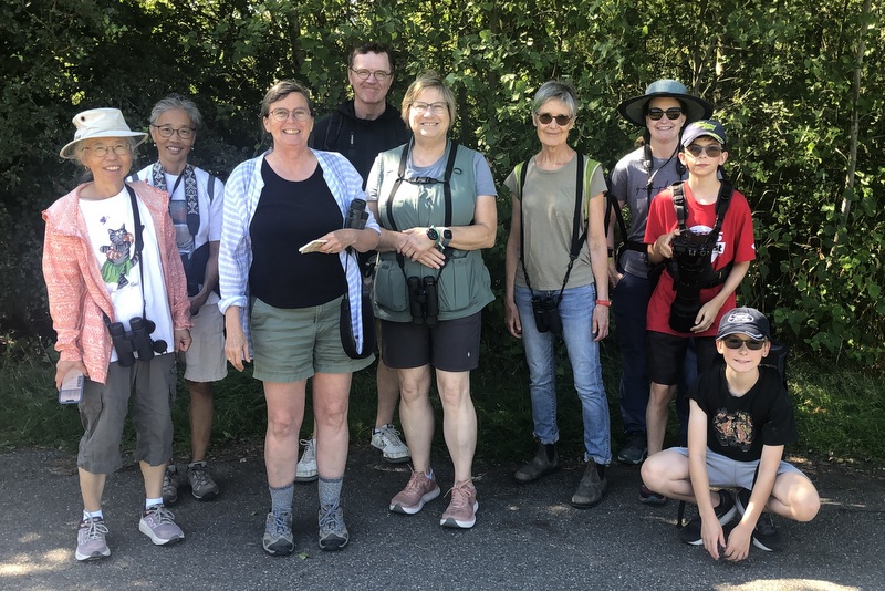 Ten birders met on a sunny July morning in the North 40 Park Reserve: Alaina, Cole, Arthur, Connie, Grace, Henry, Naoko, Margaret, Bob and Dottie. A steady breeze from the west held for the whole morning and kept the temperature pleasant, especially in the shade. Common Yellowthroats called continuously from the tall grass, but made only a few fleeting appearances. The park was new to several of the birders, and we walked slowly, stopping to read the history plaques and marvel at the flat, treeless space it once was. We saw Black-capped Chickadees, Spotted Towhees, Robins, Song Sparrows, Savannah Sparrows, House Finches, Goldfinches and Cedar Waxwings, though all in low numbers. Merlin heard Bewick’s Wrens and a Downy Woodpecker, but we couldn’t find them.