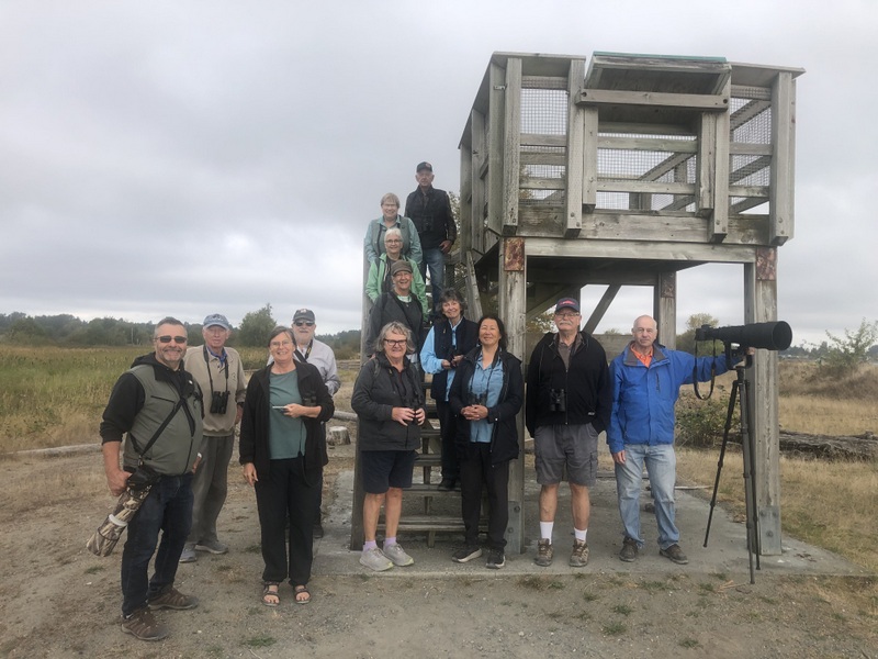 Thirteen Delta Nats met at Centennial Beach on a gray, still, and mild, early fall morning — Anne, Dottie, Bob, Lorna, Connie, Vicky, Roger, Jim, Lynne, Warren, Lindly, Freddie, and David. Only crows were active near the parking lot, although later we did see a small flock of Brewer’s Blackbirds fly into one of the taller trees. On the pond were Mallards and a single Gadwall pair. From the beach you could see hundreds of dark silhouettes floating quietly off-shore, stretching the whole extent of the park. Nearly all appeared to be Mallards, with some American Wigeon intermixed, thought the quality of the light made identifications difficult. The sand was quiet except for a few crows and a dead seal.