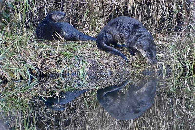In the southwest pond we added Hooded Mergansers, Green-winged Teal and Coots. We heard Kingfishers several times and finally saw one land in a tree across the pond. Then it spent several minutes hovering before returning to the tree. Two River Otters were resting on the bank before swimming away.