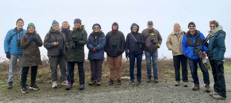 13 Delta Nats met at Boundary Bay Dyke at 104th St in dense fog – Jeff, Dorothy, Connie, Christine G, Lee, Jacquie, Fen, Teresa, Bob, Dottie, Freddie, Lori and Terry. We could barely make out a pair of Bald Eagles vocalizing on a treetop and some American Wigeon and Green-winged Teal in the water. Christine had just come from the Dyke on the Tsawwassen First Nation near the 41B Street pond where there was no fog and where she had seen a Beaver, Whimbrels and more. So we decided to move our outing there instead.