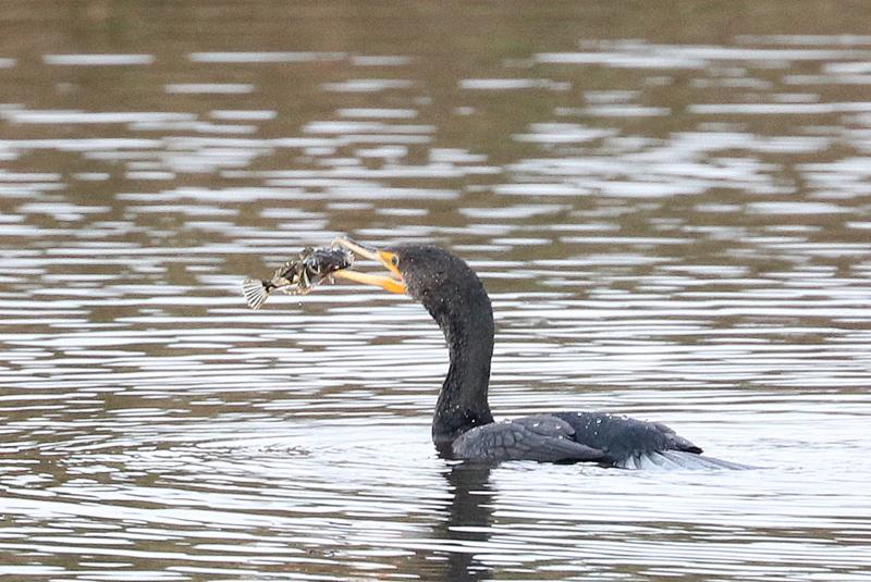 The resident Kingfisher did not put in an appearance at the bridge at the beginning or the end of the outing. There were Wigeon, Mallards and a pair of Common Goldeneye in the river. Flocks of Canada Geese, ducks and cormorants flew over. Farther along the river were Cackling Geese, Scaup, Gadwall, Common Mergansers and a Double-crested Cormorant that entertained us by bringing up fish and getting them in position to swallow.