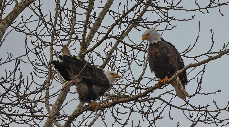 From the first tower we could see a flock of Green-winged Teal and 3 Greater Yellowlegs feeding in the shallow water. Bob also photographed a distant Trumpeter Swan from the tower. A pair of Bald Eagles was perched together in a tree presenting courtship behaviour – putting beaks together.