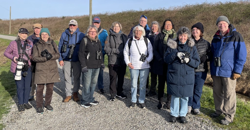 We were joined by 6 more birders at the parking area by the TFN pond at 41B Street. Our group of 15 walked to the dyke where the tide was perfect. A very large flock of Dunlin was flying and landing close to shore – making lovely murmuations.